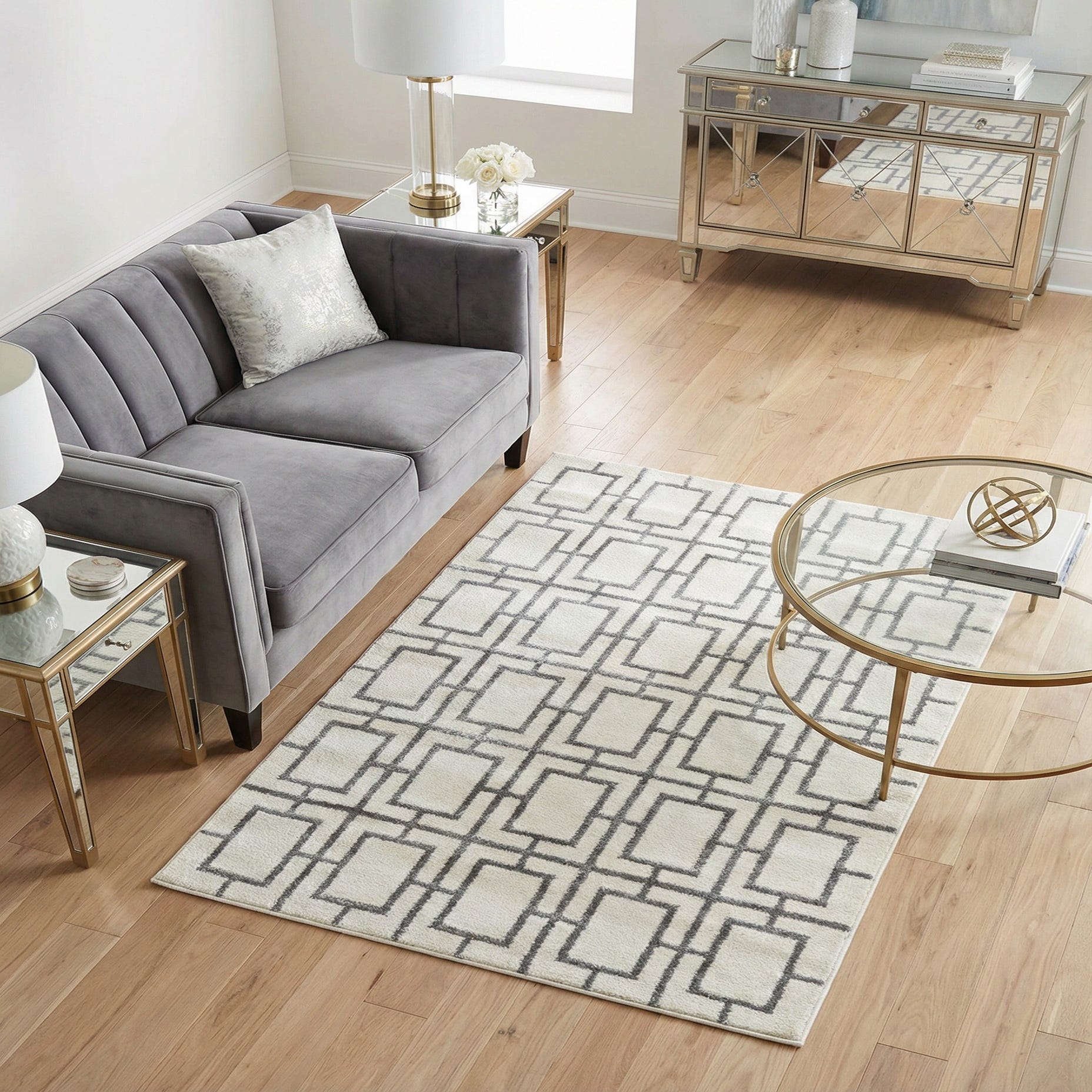 This piece works well in contemporary and modern glam interiors where metallic accents or mirrored finishes are present, and it also complements minimalist or transitional schemes that need a restrained pattern. Use it to anchor a small seating area, place it at the foot of the bed, or set it beneath an entry console to introduce texture and subtle contrast. The White Silver and Silver palette pairs easily with cool grays, crisp whites, and chrome or glass furnishings for a cohesive, polished look.