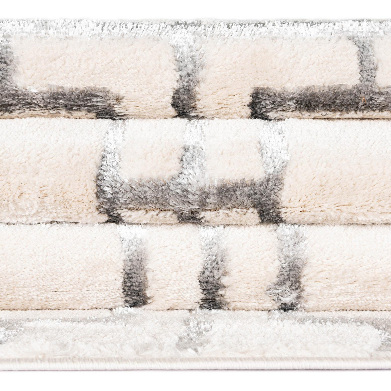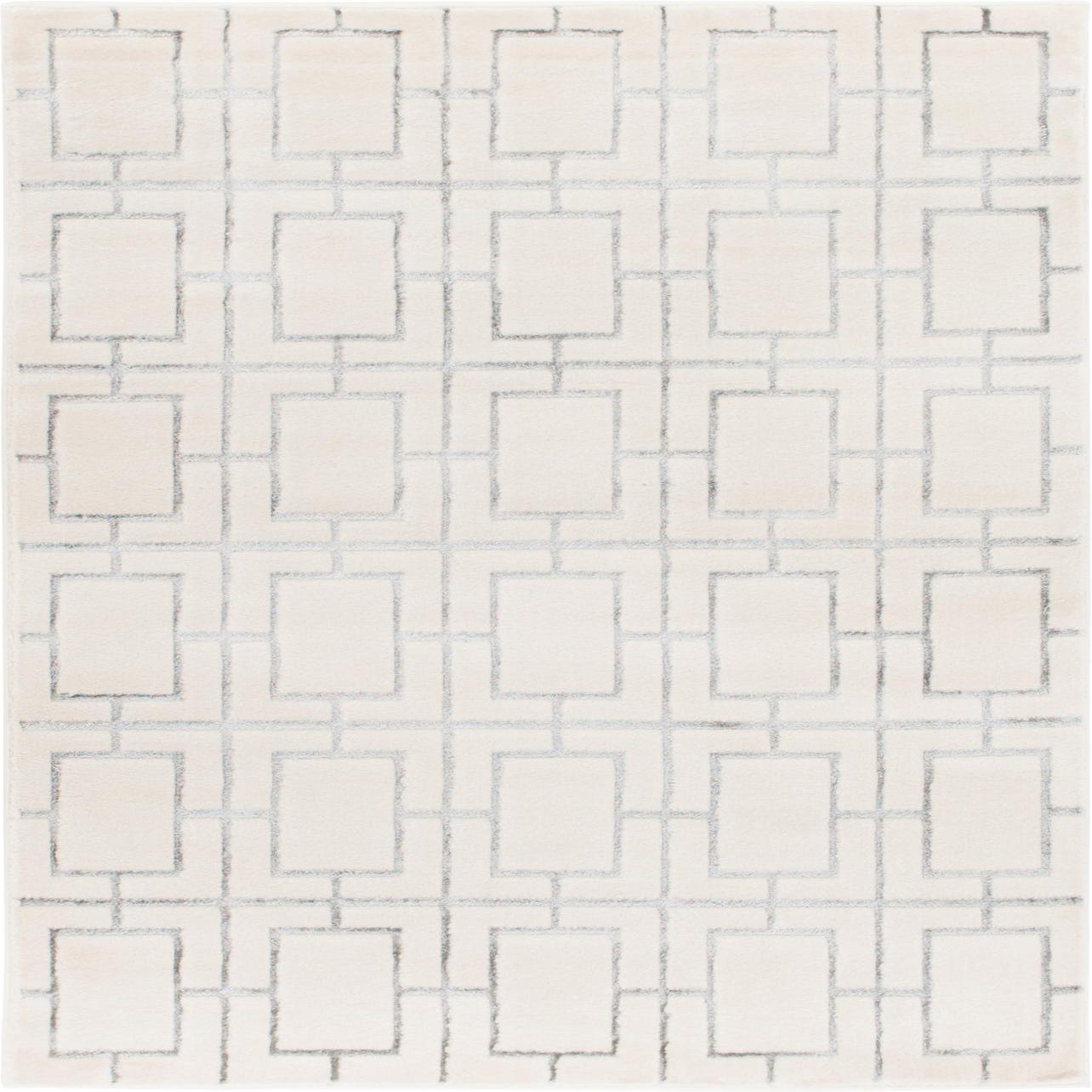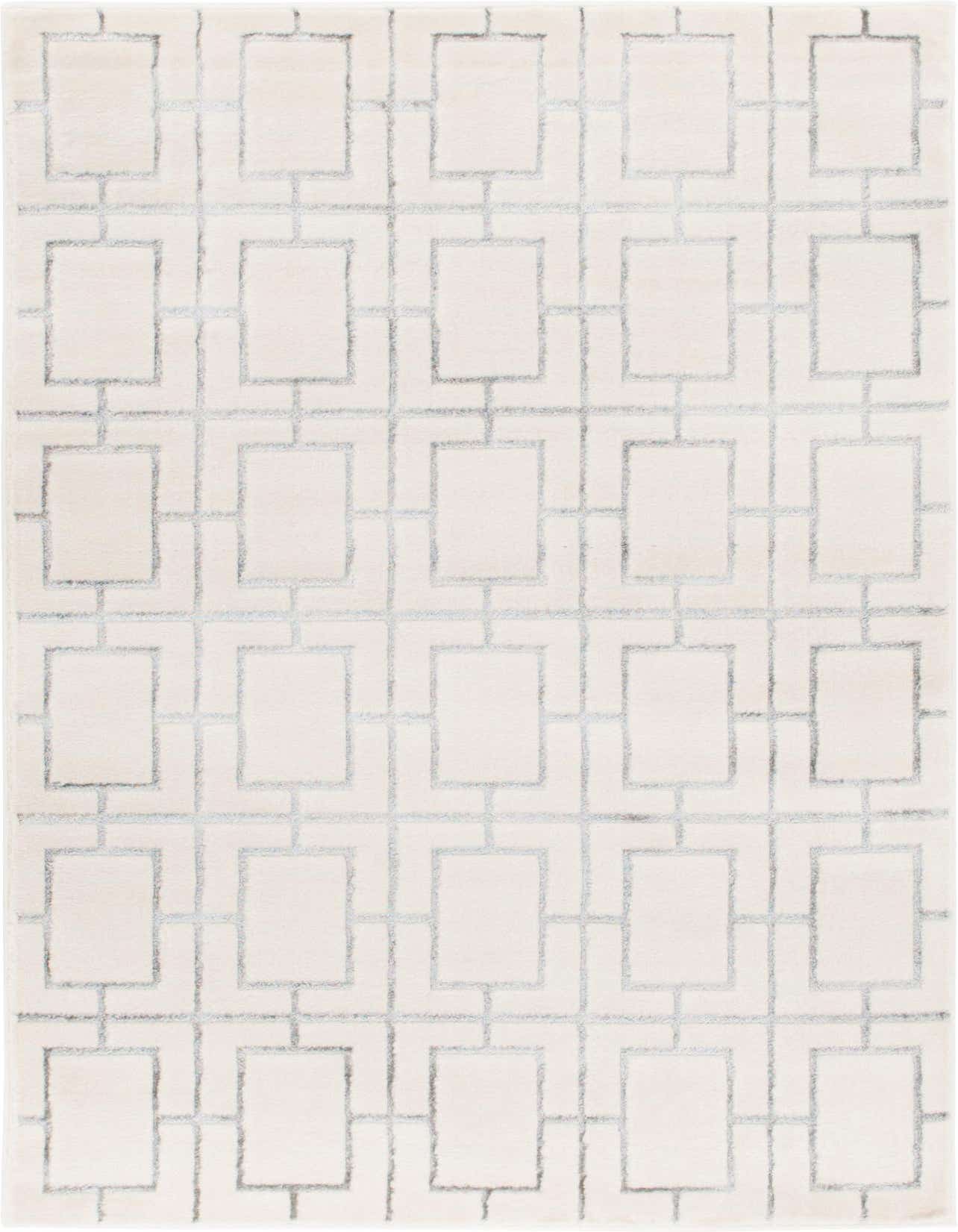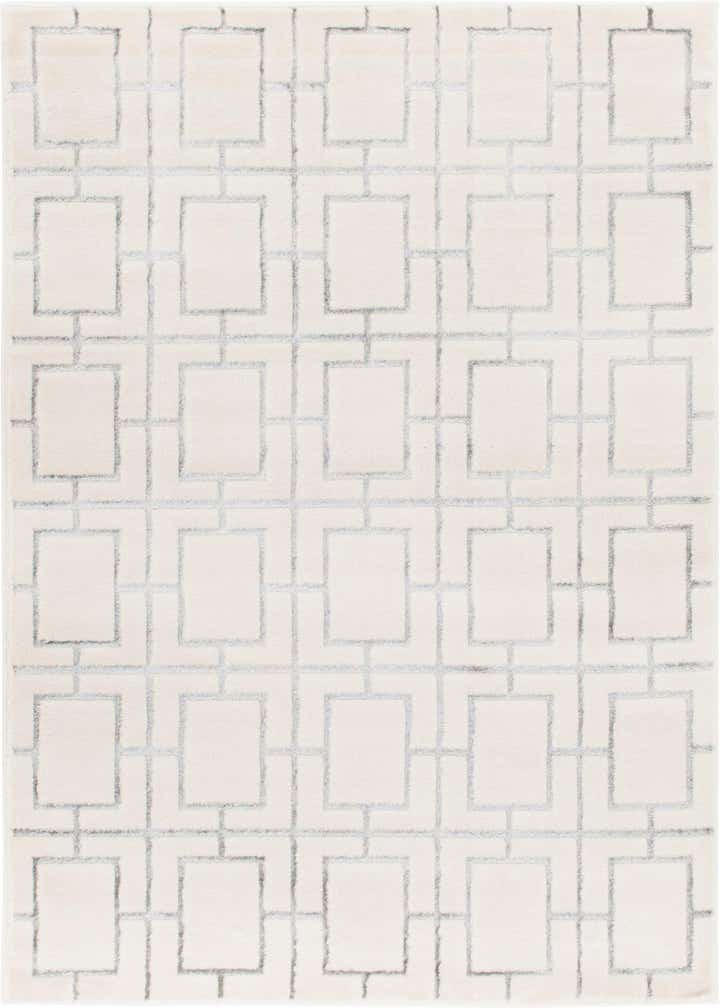 A white-silver ground provides a luminous, neutral base for a structured trellis of silver rectangles. The geometric pattern is composed of linked, softened-edge boxes that create a crisp, contemporary grid without feeling harsh. Machine-made from 70% polypropylene and 30% polyester, the rug’s low-profile pile has a soft, slightly plush hand and a subtle sheen from the polyester fibers; running a fingertip across the surface reveals gentle texture where the silver pattern stands just a touch higher than the field.