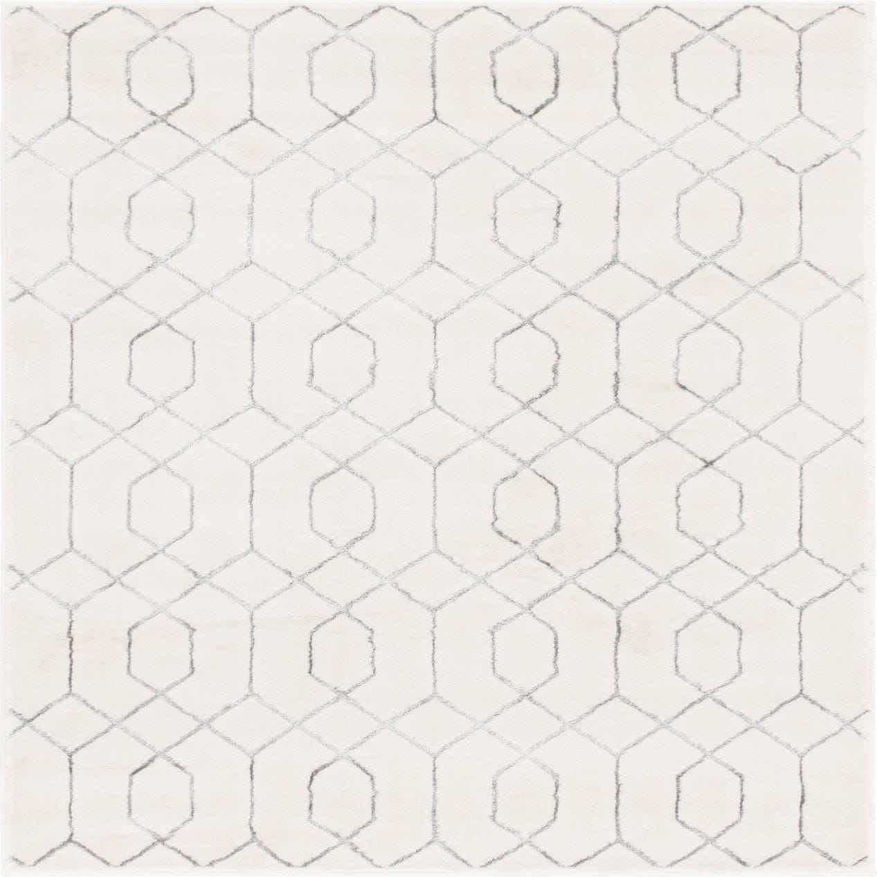 Soft, geometric trellis work in Silver traces an interlocking pattern of elongated octagons and diamond links across a White Silver ground. The silver lines have a slightly hand-drawn quality that adds gentle movement without dominating the field. Machine made from 70% polypropylene and 30% polyester, the pile feels soft and slightly plush underfoot with a low-sheen finish that reflects light subtly for a refined, modern look.