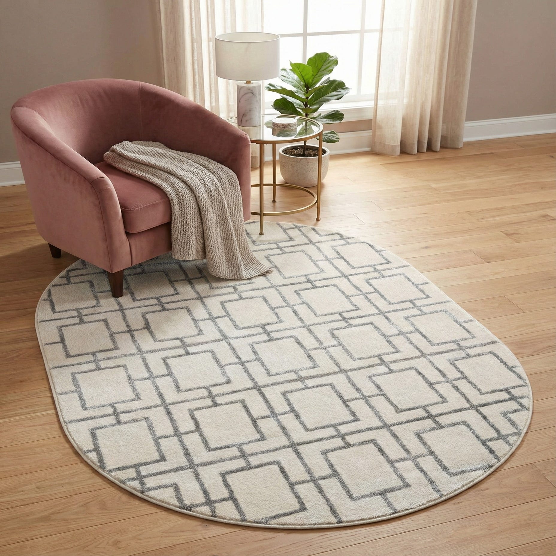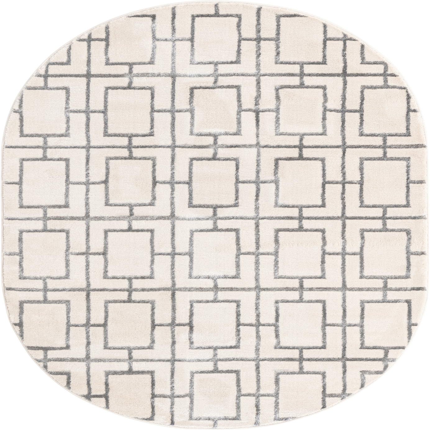 A modern trellis of linked rectangles sits cleanly against a White Silver ground, the Silver pattern lines forming a crisp, geometric lattice that adds structure without overwhelming the space. Machine made from 70% polypropylene and 30% polyester, the rug has a low-profile, dense pile with a soft, velvety hand and a subtle luster that catches light for a refined, polished look. The oval silhouette softens the grid motif and gives a tailored finish to the overall design.