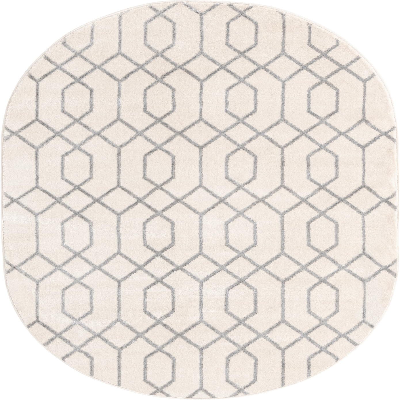 A soft, low-profile pile and a crisp White Silver ground set the stage for a refined geometric trellis in cool Silver. The linked octagon and lattice motif runs across the oval shape with clean, even lines that give the rug a modern, tailored look. Machine Made of 70% Polypropylene and 30% Polyester, the surface feels smooth underfoot with a subtle sheen from the polyester fibers and a slightly dense hand that holds the pattern definition.