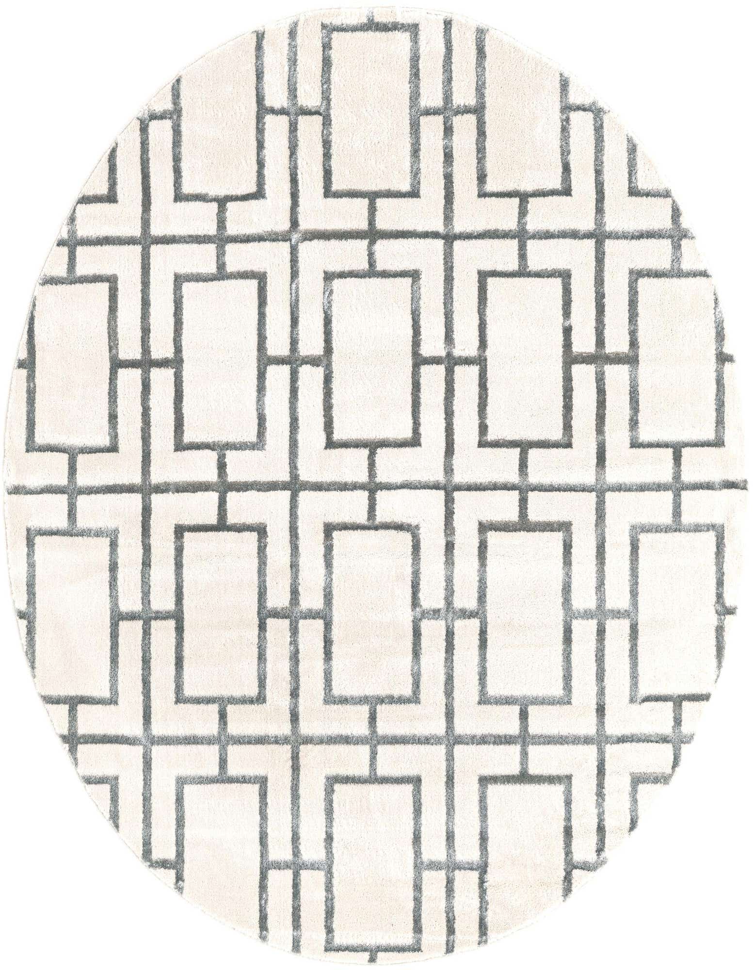 A clean, modern trellis of linked rectangles and squares sits against a White Silver ground, the Silver pattern adding a crisp, architectural touch. Machine made from 70% polypropylene and 30% polyester, the rug has a low-profile, softly plush pile that feels pleasant underfoot and offers a subtle sheen where the fibers catch the light. The Silver lines have a slightly velvety texture that contrasts with the smoother White Silver background, creating depth without heavy color contrast.