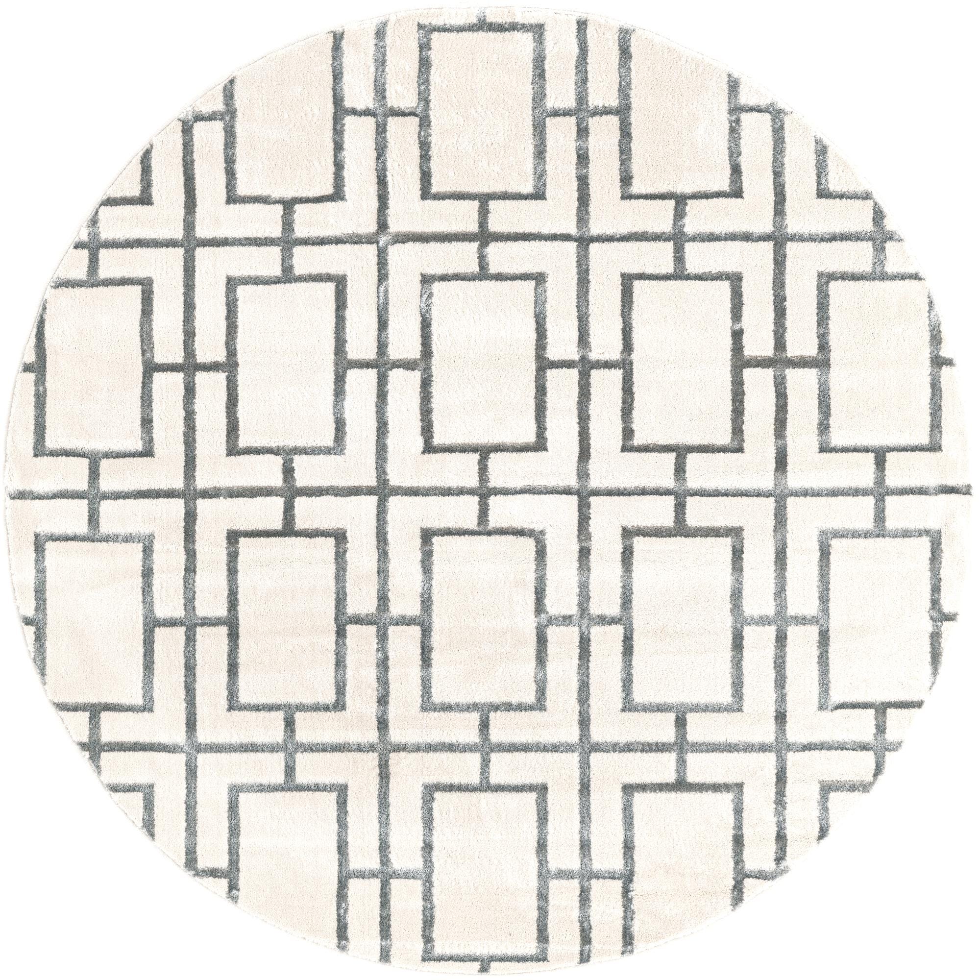A round 5' 3 x 5' 3 Rugs.com Marilyn Monroe Glam Trellis rug with a gray geometric trellis pattern on a white background.