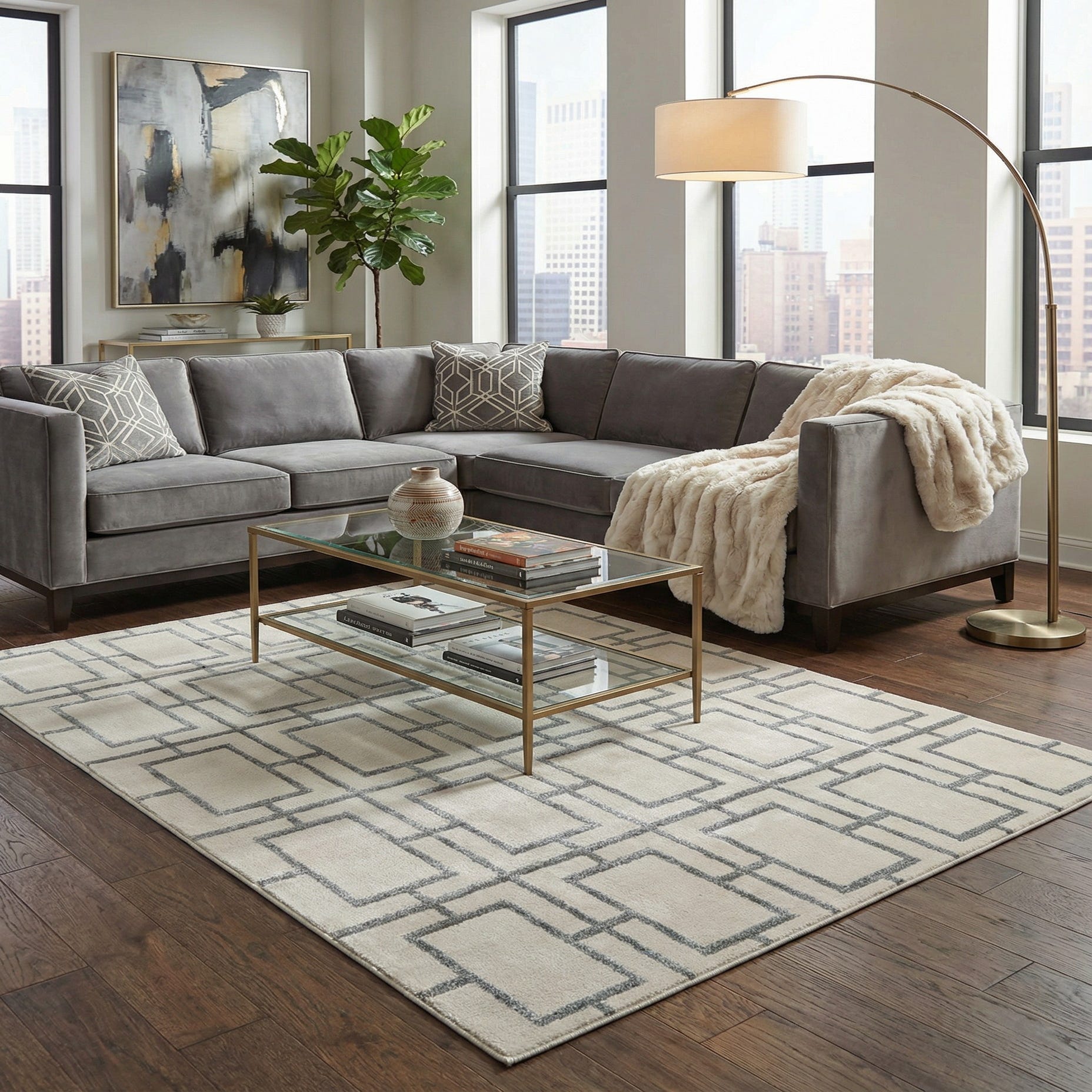 Machine-made from 70% polypropylene and 30% polyester, the rug has a low-profile pile with a smooth, slightly velvety surface and a soft sheen where the silver fibers catch the light. Underfoot it feels plush enough to be comfortable yet lays flat for a neat, tailored look. This piece pairs well with contemporary and transitional interiors — think a living room anchored by a sleek sofa and chrome accents, a minimalist bedroom seeking a light, airy base, or a tidy home office where the geometric pattern adds order without overwhelming the space. It also complements light woods, cool grays, navy accents, and metallic finishes.
