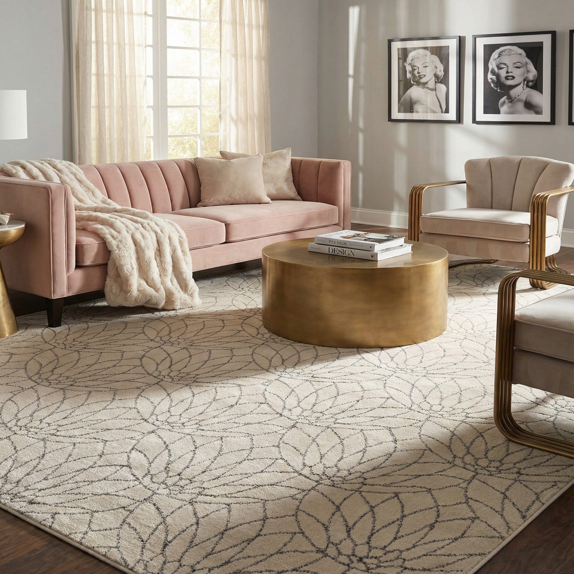 Machine-made from 70% polypropylene and 30% polyester, this rug has a soft, low pile with a gently raised texture that you can feel underfoot. A repeating floral-trellis motif in cool silver sits against a white-silver ground, creating a refined, airy pattern that adds subtle depth without overpowering the room. The neutral silver tones give the design a light-reflective quality, while the tactile outline of the motif provides visual interest up close.