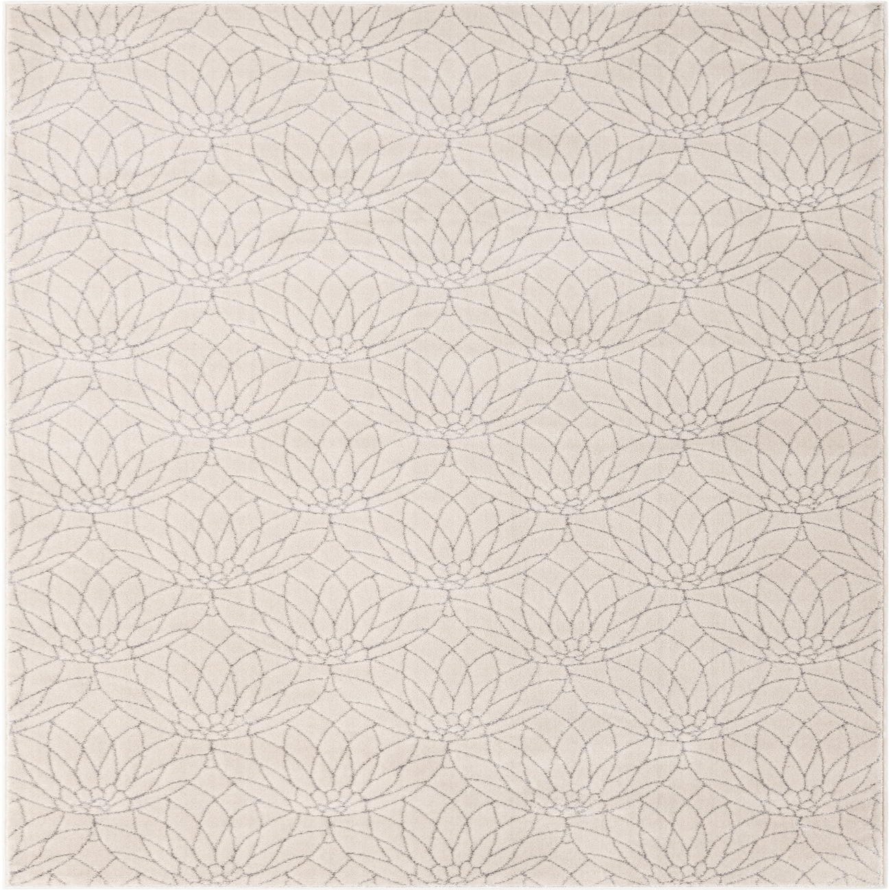 Machine-made from 70% polypropylene and 30% polyester, this rug has a soft, low pile with a gently raised texture that you can feel underfoot. A repeating floral-trellis motif in cool silver sits against a white-silver ground, creating a refined, airy pattern that adds subtle depth without overpowering the room. The neutral silver tones give the design a light-reflective quality, while the tactile outline of the motif provides visual interest up close.