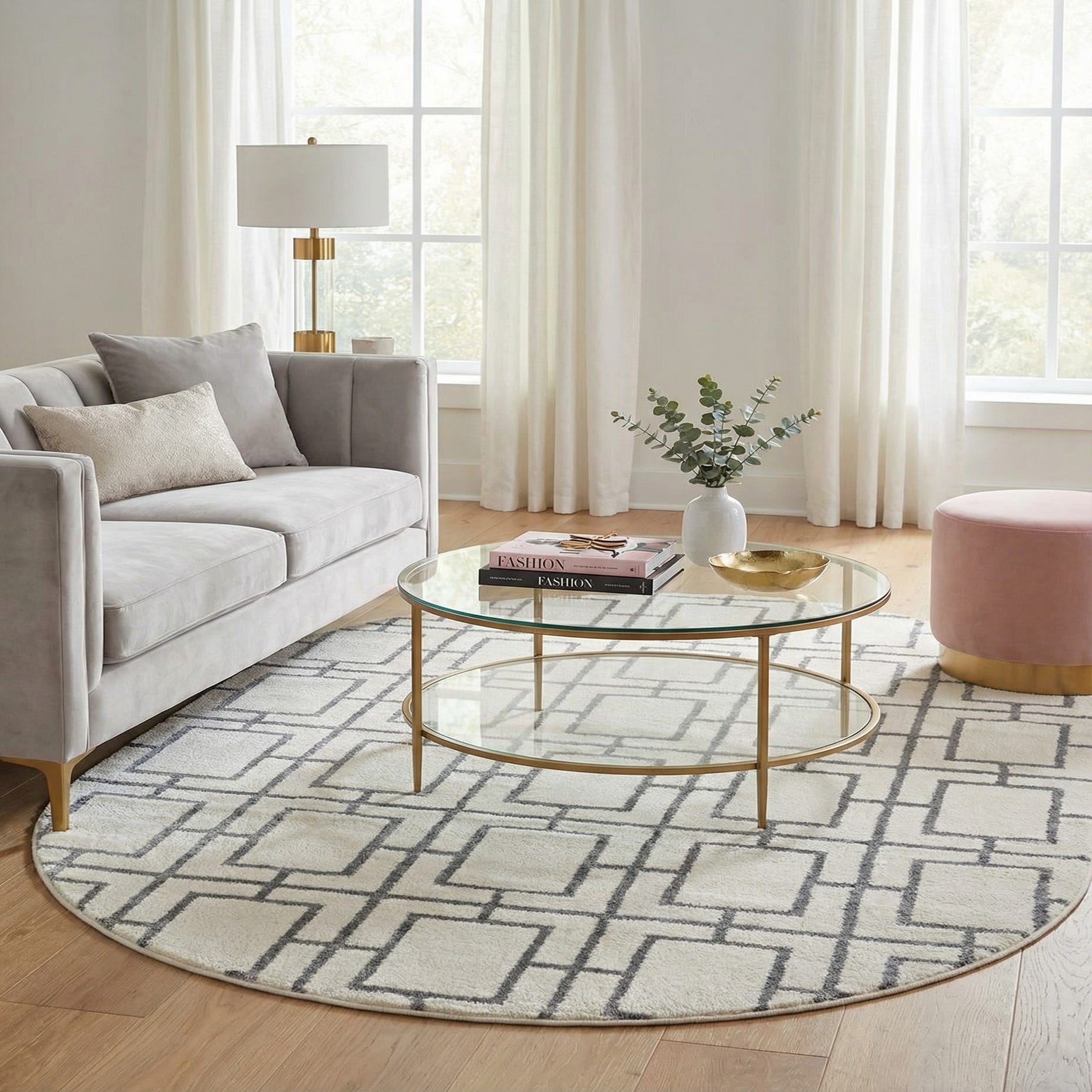 The neutral palette and refined pattern suit a variety of interiors: place the oval rug in a contemporary living area beneath a coffee table, use it to define a cozy seating nook, or lay it in an entryway to introduce a polished, modern note. It pairs well with mirrored or metallic accents for a subtle glam touch, light wood and neutral upholstery for a calm, layered look, or charcoal and black furnishings for a stronger contrast.