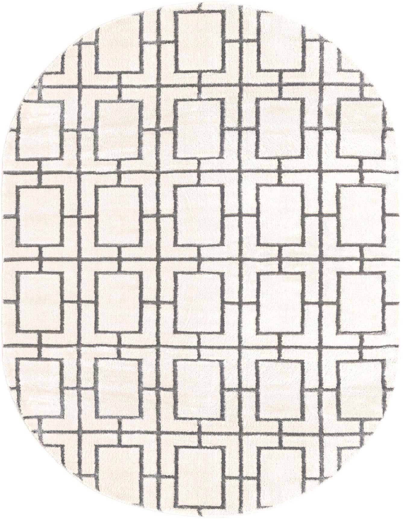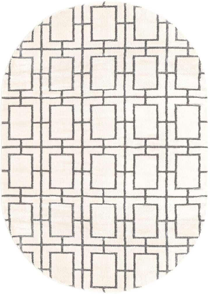 An oval 5' 3 x 8' 0 gray and white rug featuring a modern trellis pattern with textured pile.