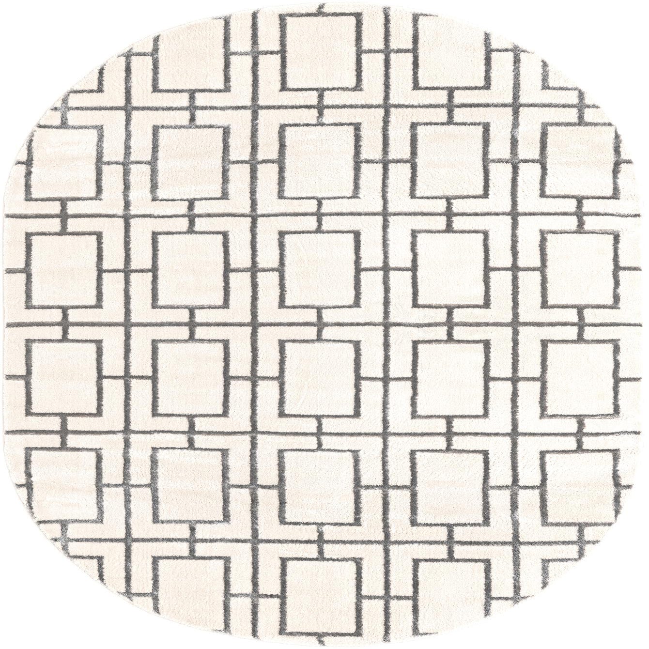 A modern trellis pattern of interlocking rectangular motifs floats across a white-silver field, the silver lines offering a crisp geometric rhythm with softly softened edges that soften the overall look. Machine-made from 70% polypropylene and 30% polyester, the pile has a smooth, low-to-medium profile with a gentle sheen from the silver fibers and a plush feel underfoot that balances structure and comfort.