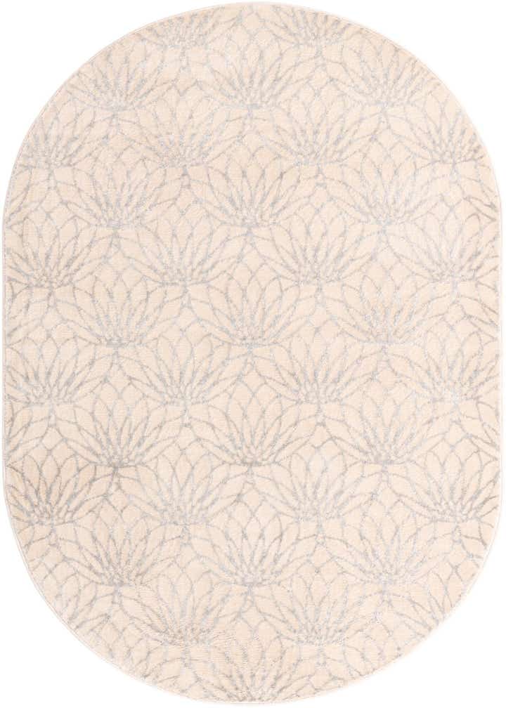 An oval 5' 3 x 8' 0 Marilyn Monroe Glam Trellis rug featuring a white background with a repeating gray floral pattern.