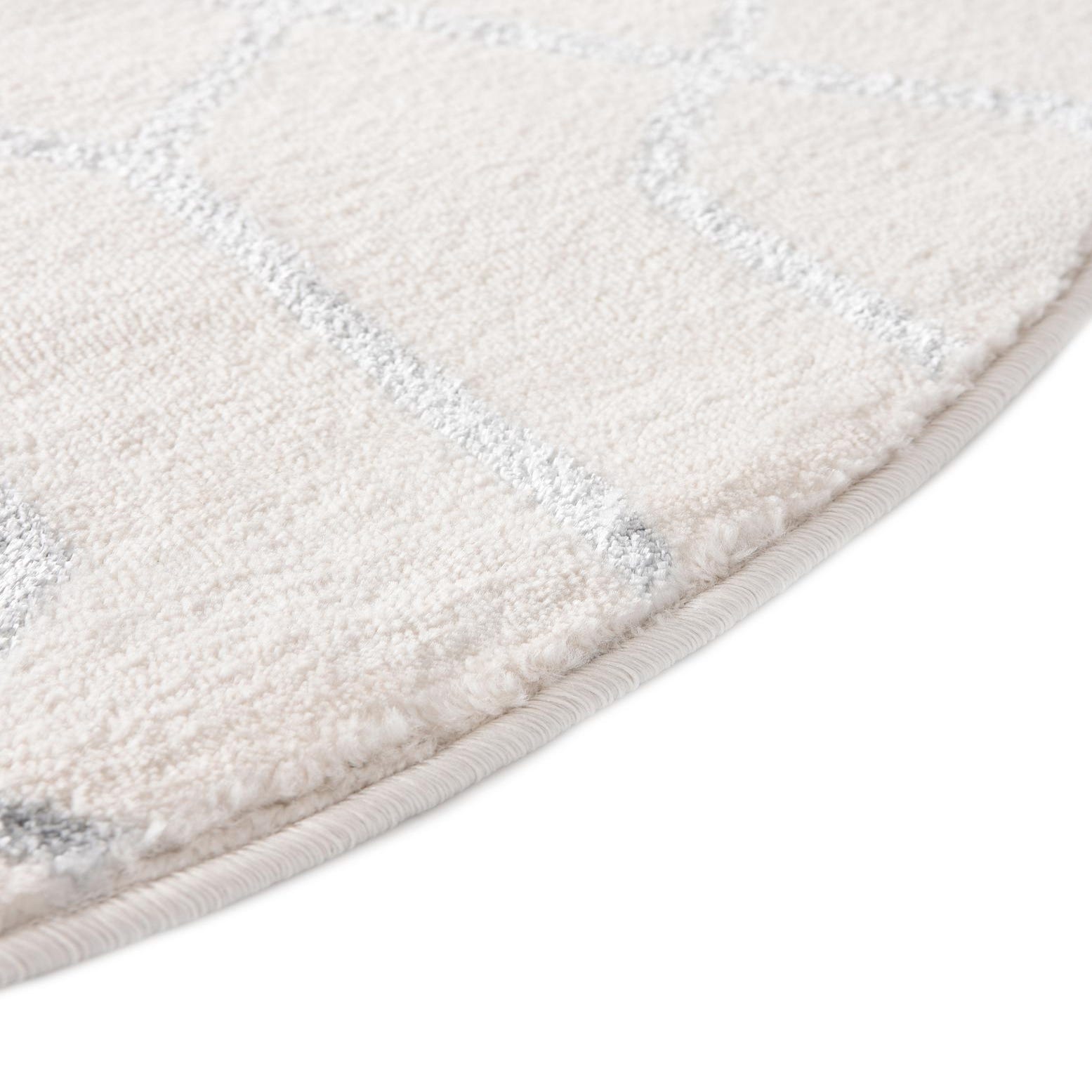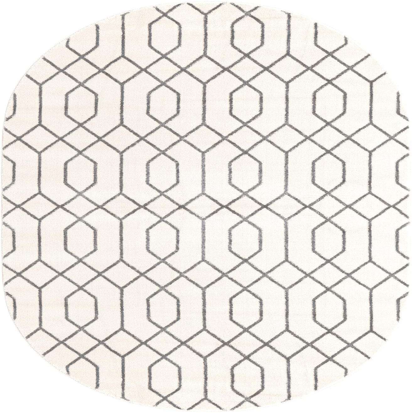 A clean White Silver field is overlaid with a repeating silver trellis of elongated hexagons and intersecting lines, forming a modern lattice that reads crisp and architectural. The oval silhouette softens the geometry, creating a balanced look that feels both structured and approachable. Running your hand across the surface, the contrasting yarns create a subtle variation in texture that highlights the pattern without overwhelming a room.