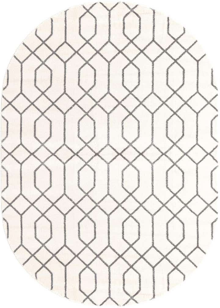 An oval 5' 3 x 8' 0 gray and white rug with a modern trellis pattern, featuring a textured pile.