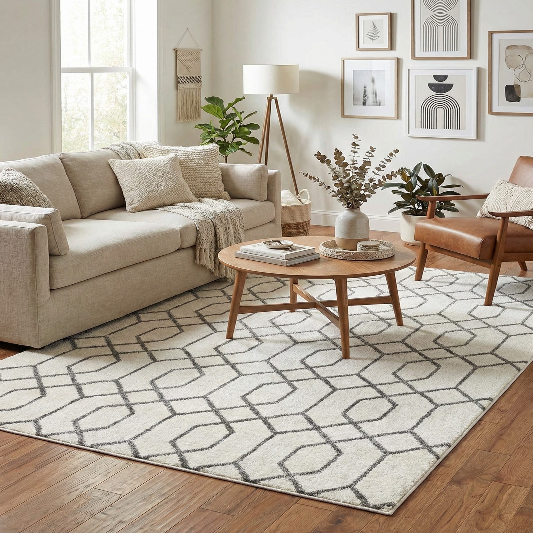 This rug works beautifully as an anchor for a living room seating group, layered beneath a coffee table, or placed in a bedroom to add pattern without overwhelming the space. Pair it with light wood floors, cool gray walls, and metallic accents or use it to balance richer textures like velvet or leather; its neutral tones and refined geometry suit contemporary, transitional, and minimalist interiors alike.