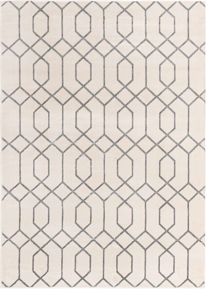 The Marilyn Monroe™ Glam Trellis area rug is a 7x10 foot elegant floor covering that combines modern design with durable construction. The rug's pattern features a trellis design that is synonymous with contemporary elegance, portrayed in a graceful lattice pattern with lines in a softer tone of Silver that gently contrast against the White Silver background.