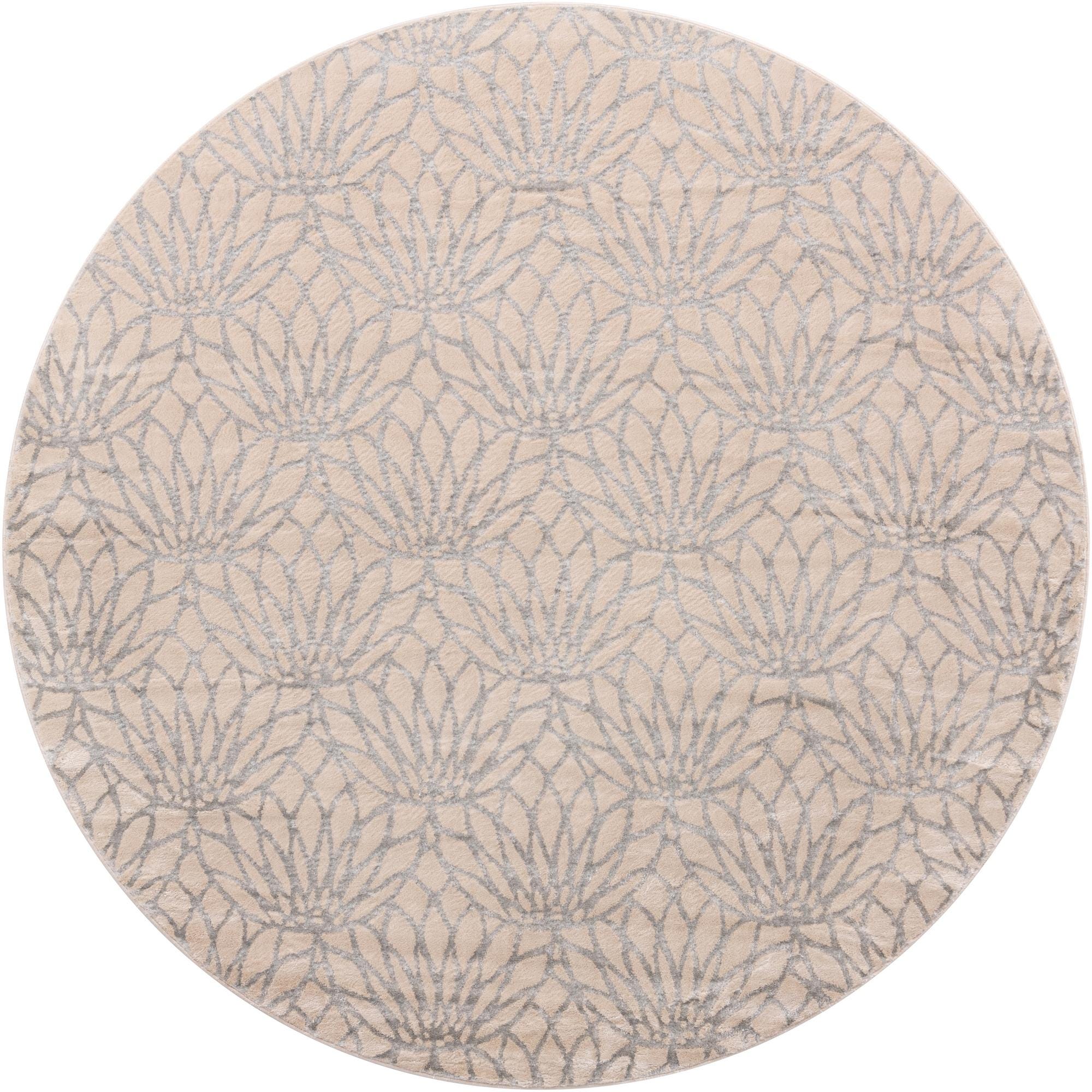 A round 7' 10 x 7' 10 Marilyn Monroe Glam Trellis rug in gray and white with a textured floral pattern.