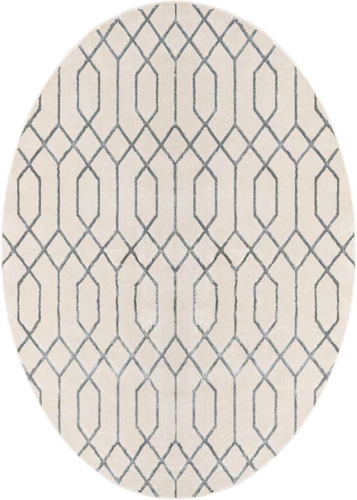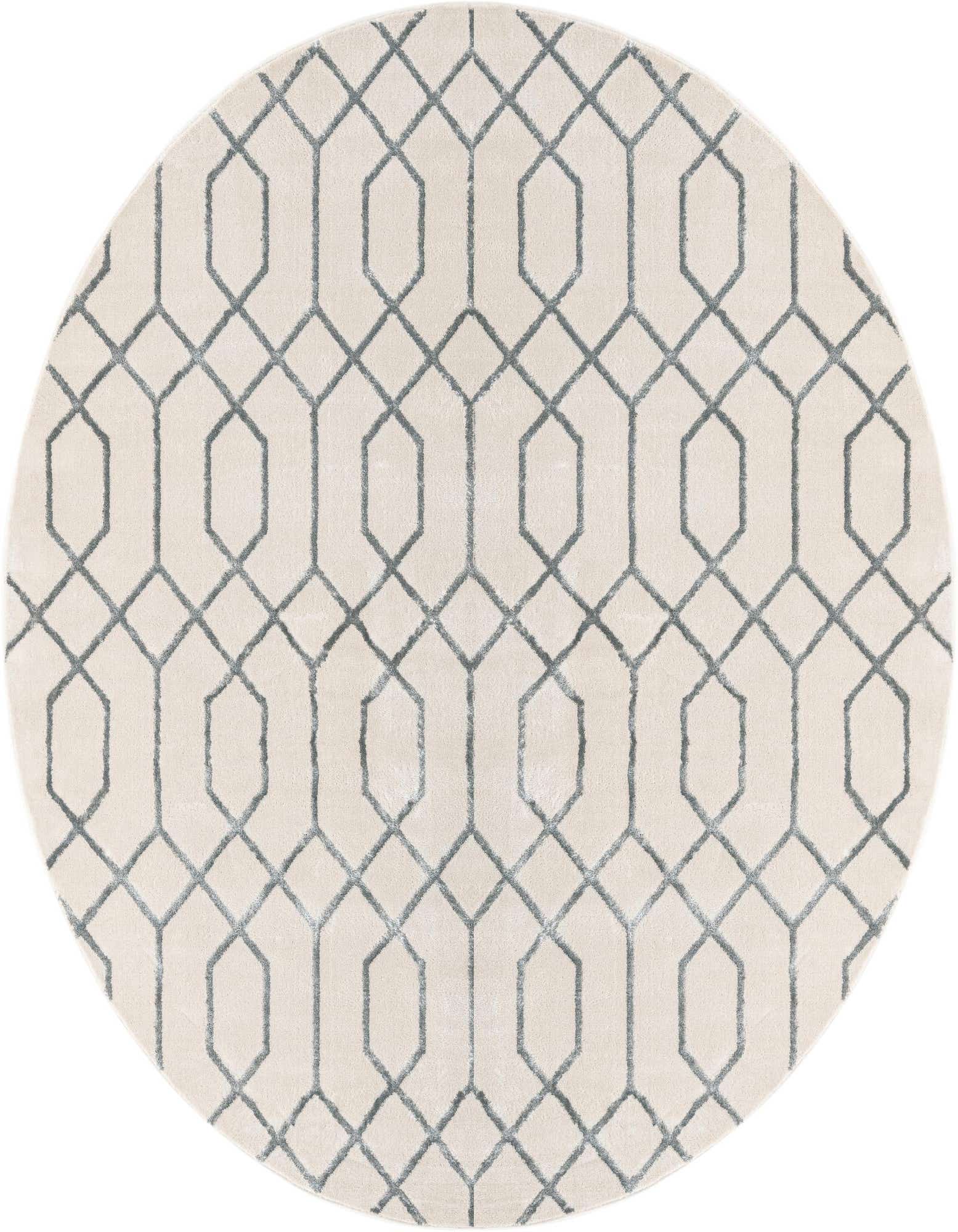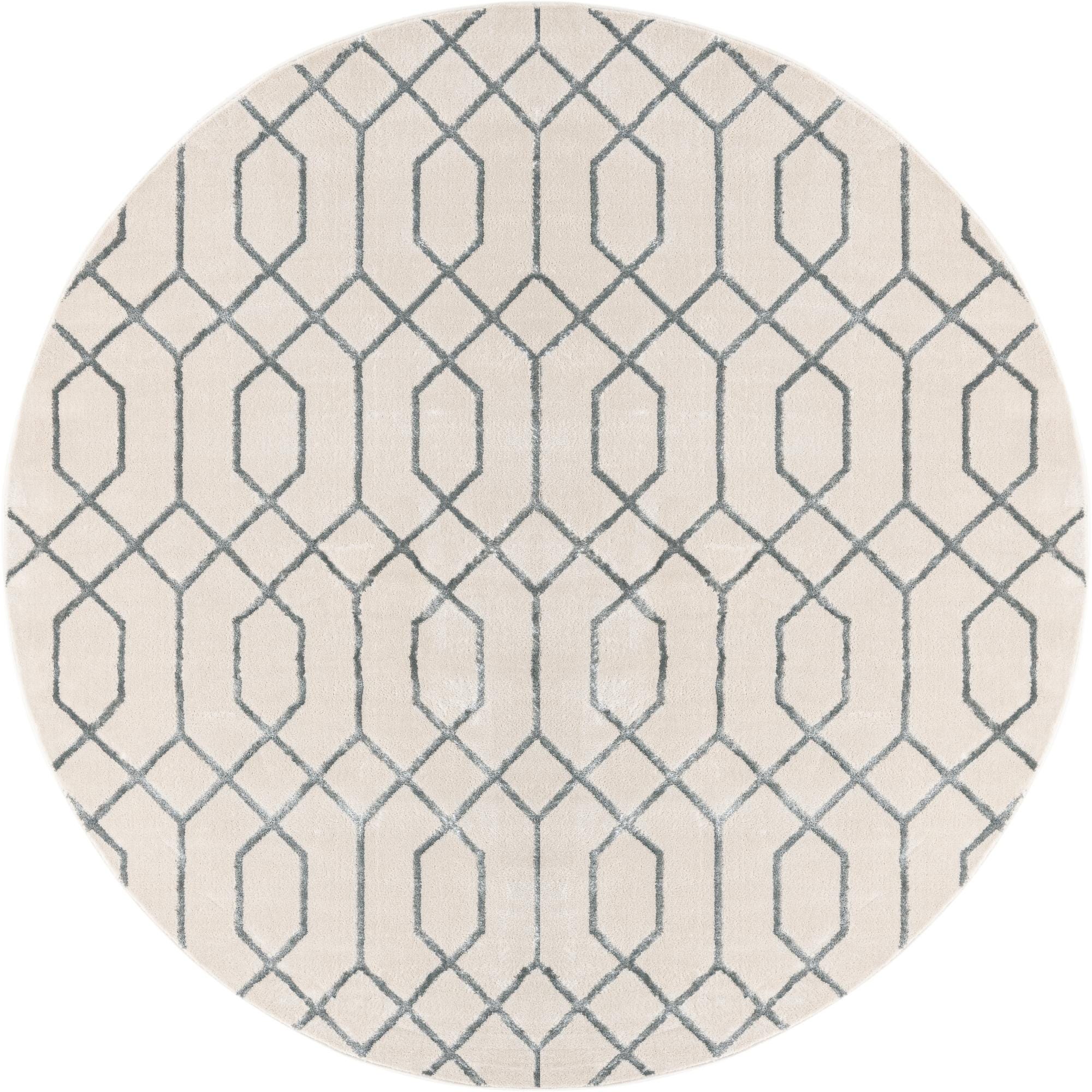 A round, 7' 10 x 7' 10 gray and white rug with a modern trellis pattern, suitable for indoor use.