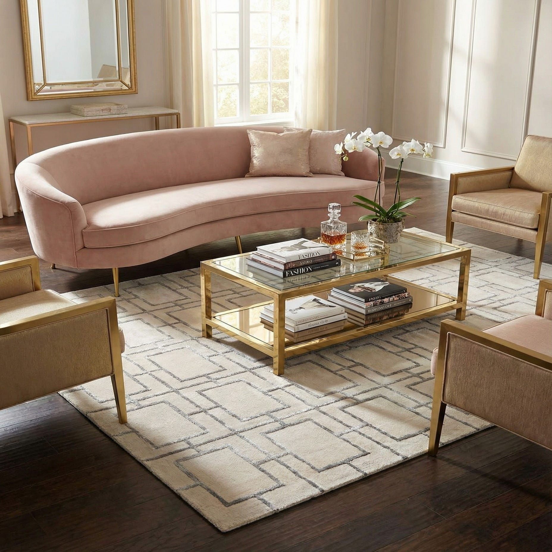 Machine made from 70% polypropylene and 30% polyester, the rug has a low-to-medium pile with a soft, slightly plush hand and a subtle sheen that catches light on the silver accents. The contrast between the raised silver pattern and the lighter background provides gentle definition underfoot. Ideal for anchoring a dining area or seating group, it also works well as a polished layer in a bedroom or home office. Pair it with chrome or brushed metal accents, pale woods, and muted textiles for a modern-glam or transitional look, or use it to add quiet graphic interest to a minimalist or Scandinavian-inspired space.