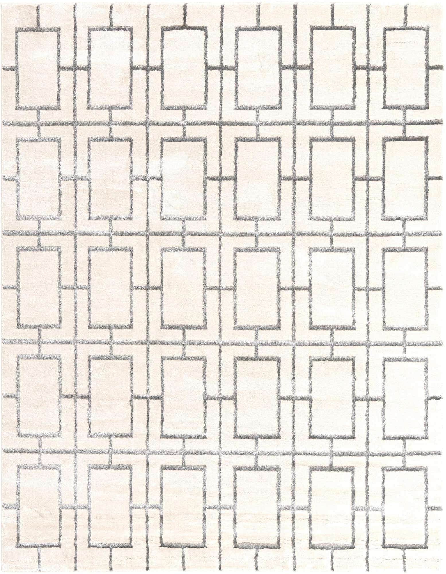 A modern geometric trellis of interconnected rectangles in silver sits on a clean white-silver ground, offering a calm, architectural pattern that balances crisp lines with a softened, hand-drawn edge. The repeating rectangular motif creates visual rhythm without overpowering a room, making it easy to pair with streamlined furniture or layered with textured throws and pillows. The overall style leans contemporary with a nod to transitional design, helping it coordinate with both cool-toned and neutral palettes.