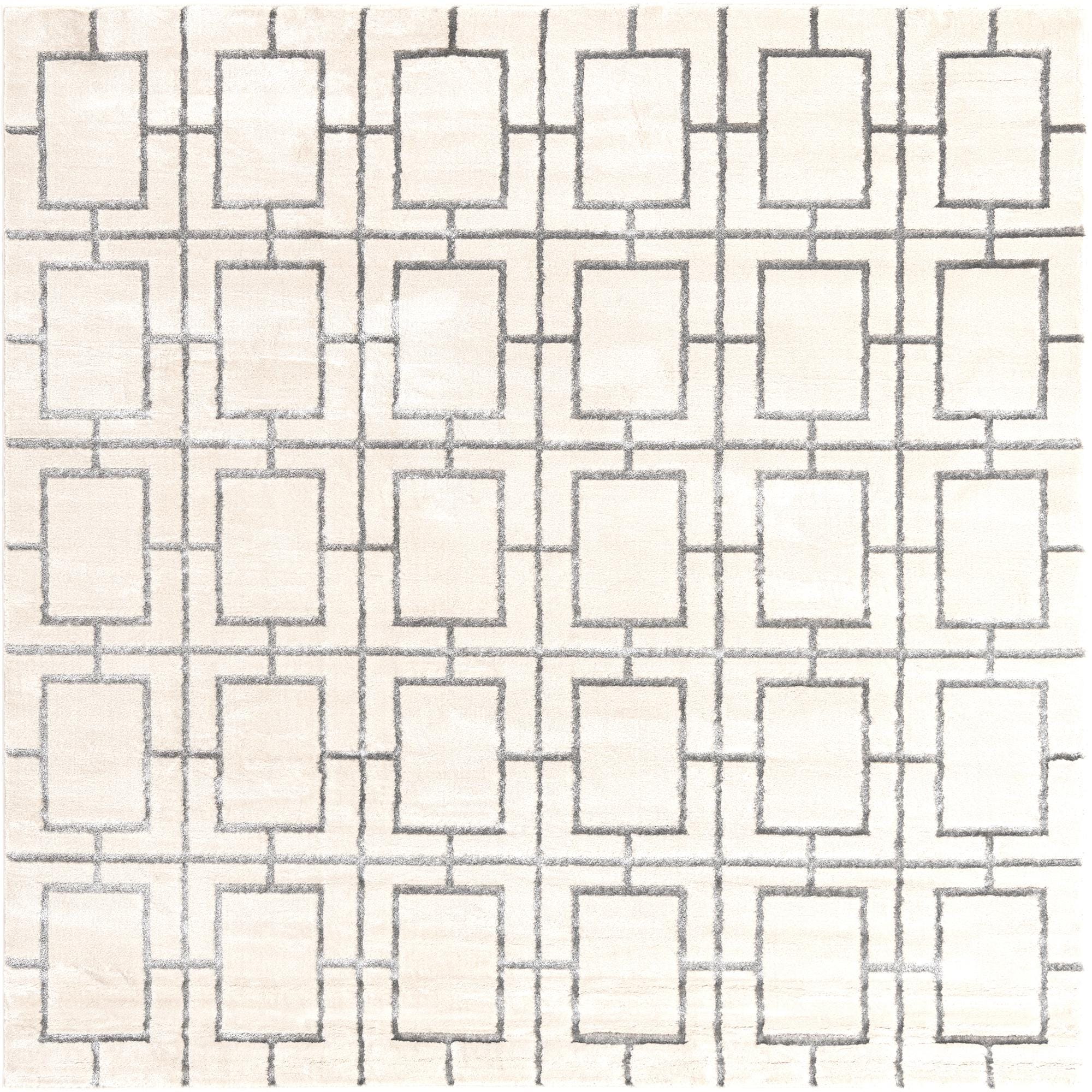 A 7' 10 x 7' 10 square rug featuring a modern gray trellis pattern over a soft white background, showcasing its textured high pile.