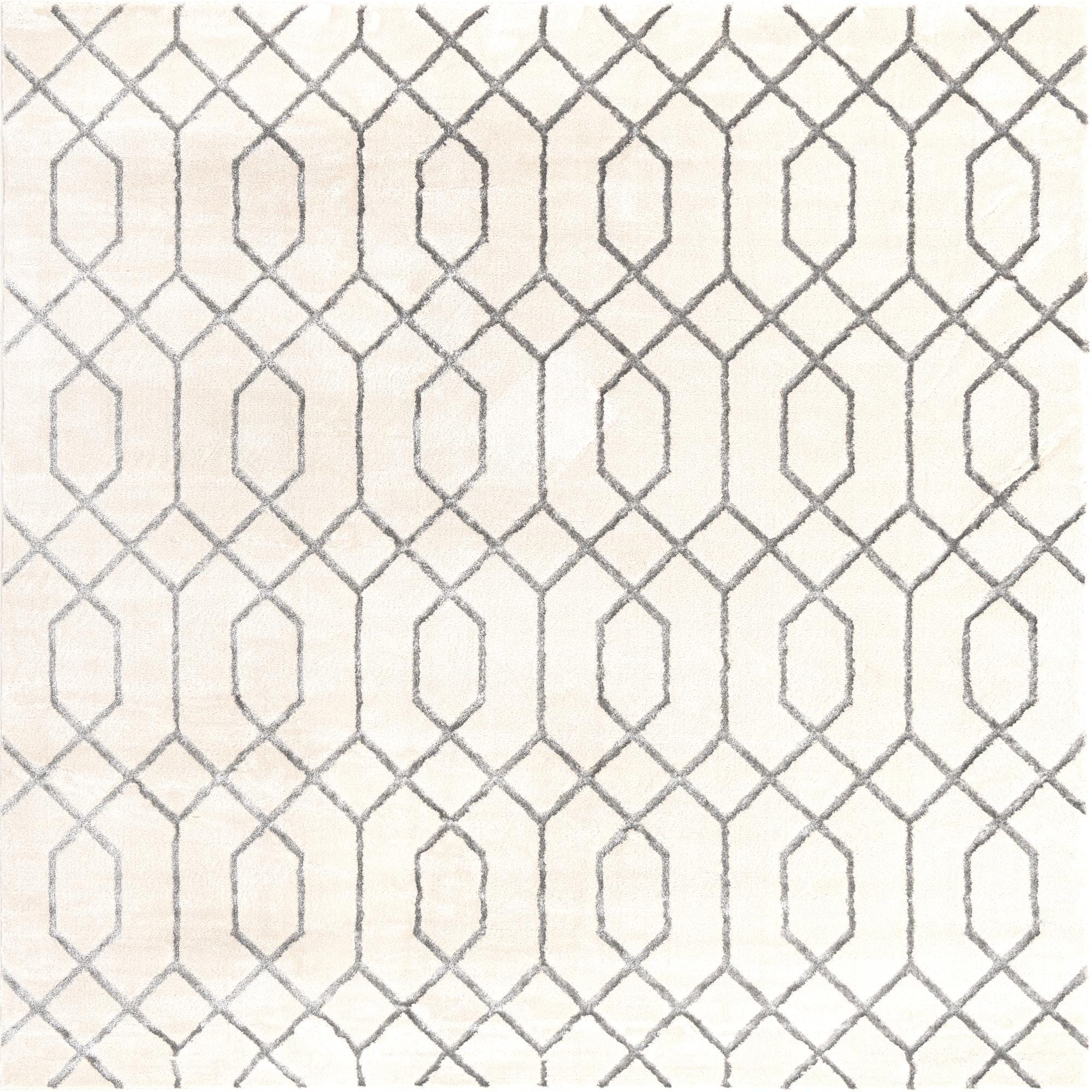 A 7' 10 x 7' 10 square gray and white Marilyn Monroe Glam Trellis rug with a modern geometric pattern.