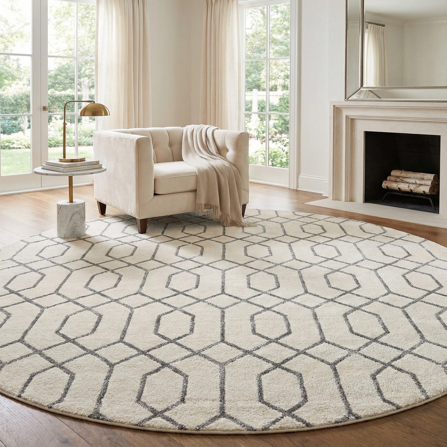 This oval piece works well as an anchor in living rooms and seating areas, under an oval dining table, or layered at the foot of a bed to add shape and softness. Pair it with cool neutrals and metallic finishes—brushed nickel, chrome, or mirrored surfaces—to emphasize the silver lines, or soften the look with light wood furniture and textured linens for a balanced, modern-transitional interior. Its restrained palette and geometric rhythm make it easy to coordinate with contemporary, minimalist, or glam-inspired décor.