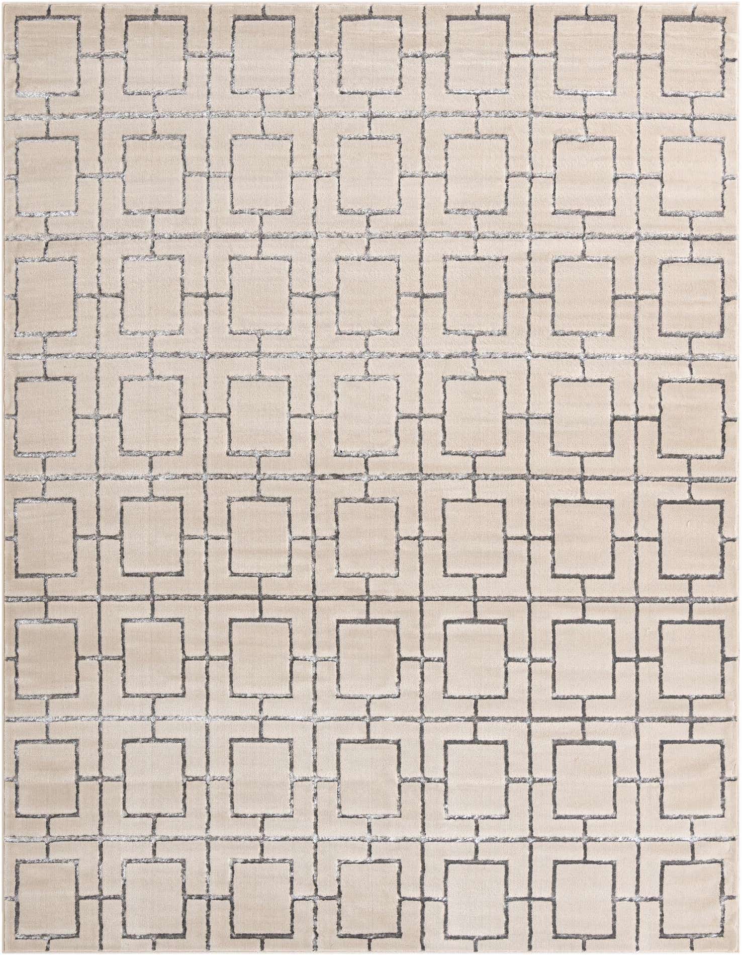 A clean geometric trellis of linked squares lays over a White Silver field, the silver lines forming a measured, grid-like pattern that reads both modern and refined. Machine made of 70% polypropylene and 30% polyester, the rug has a low-profile pile that feels smooth and dense underhand; the silver accents lift slightly from the background to create a gentle tactile contrast and a soft metallic sheen that catches light without overpowering the room.