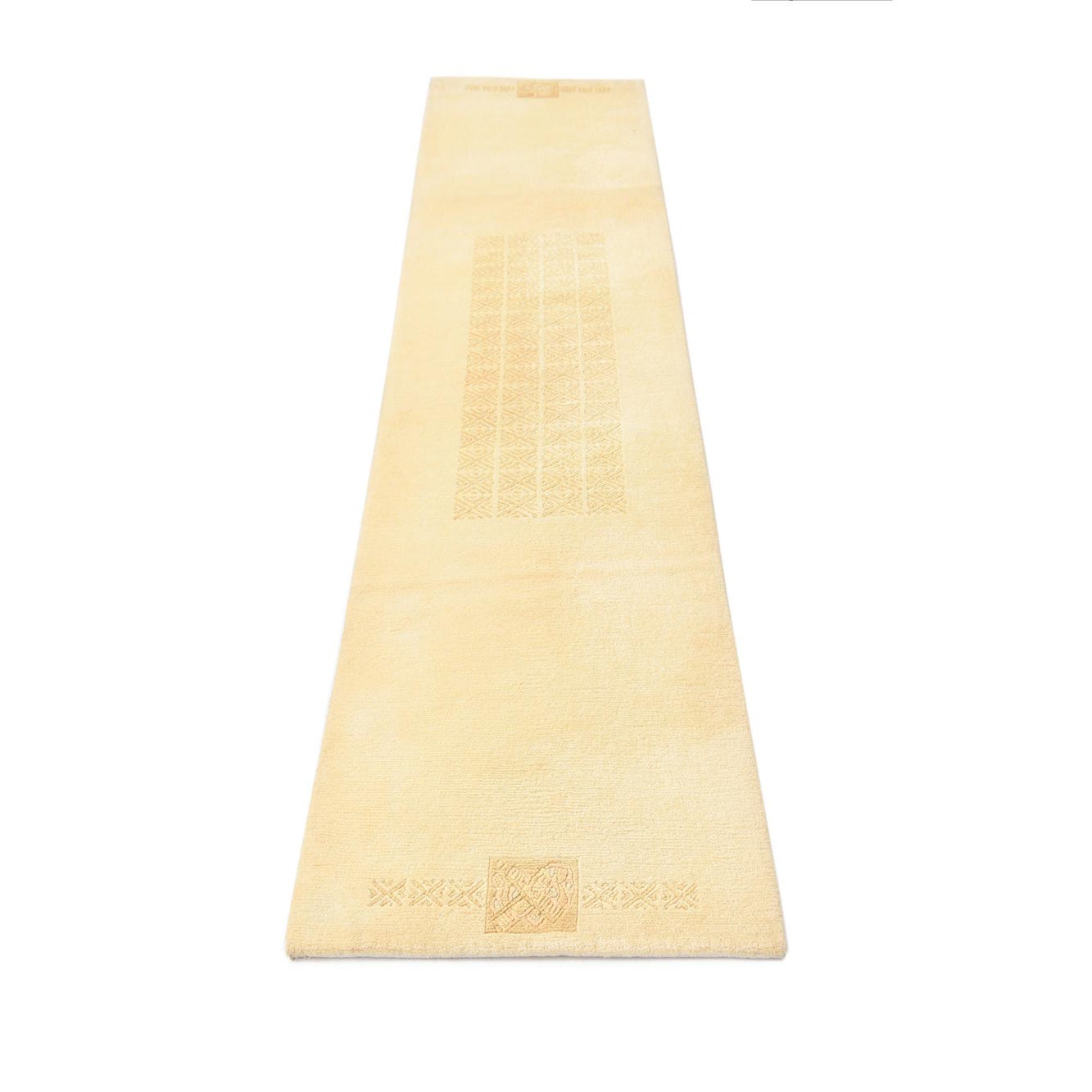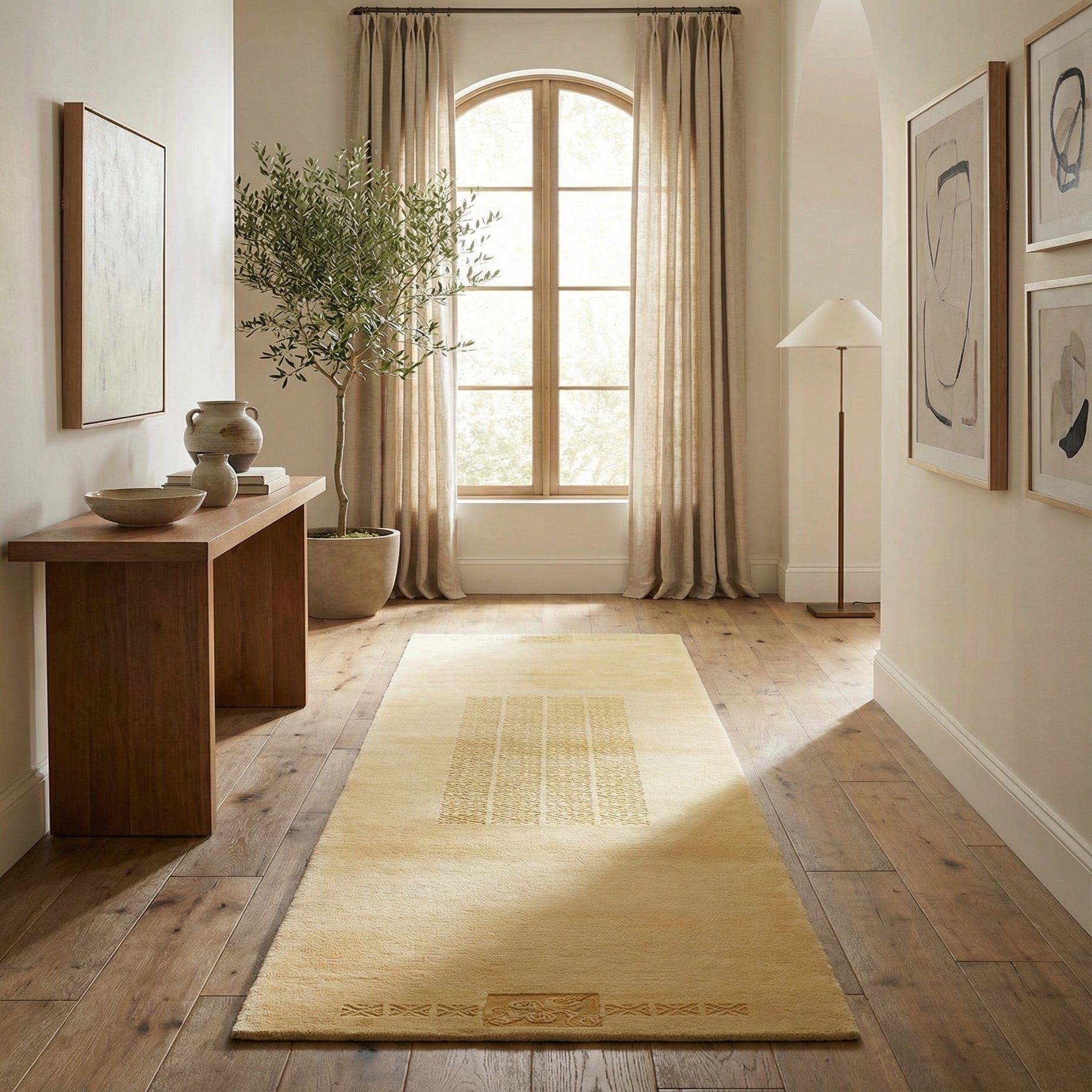 A 10 ft runner rug in shades of yellow and gold, featuring a modern Persian design with geometric patterns and ornate motifs at each end, ideal for a hallway.