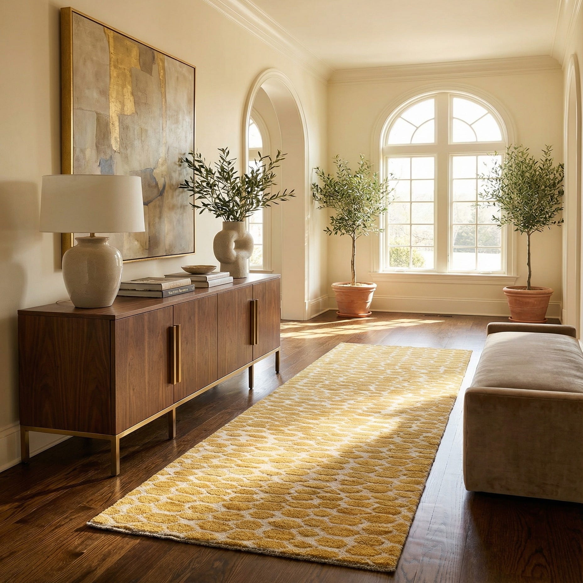 A 10 ft runner rug with a modern abstract pattern in yellow and off-white, handmade from wool, perfect for a hallway.