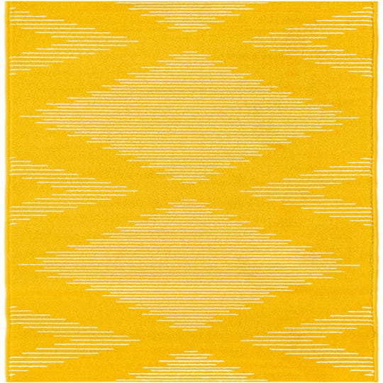 A 10 ft yellow runner rug with a modern geometric pattern of white horizontal stripes forming diamond shapes, ideal for a hallway.