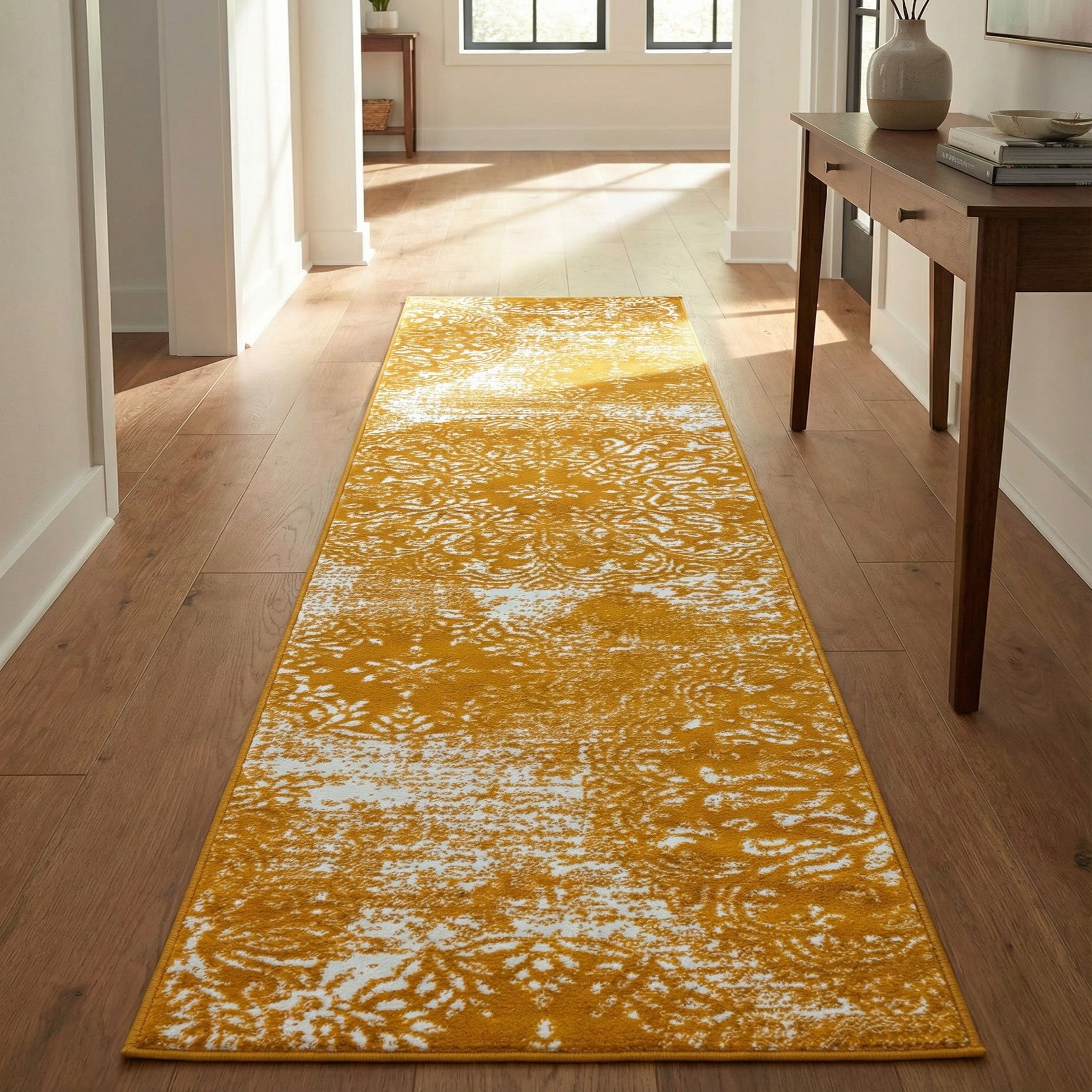 A 10 ft yellow and white runner rug featuring a distressed traditional floral pattern, ideal for a hallway.