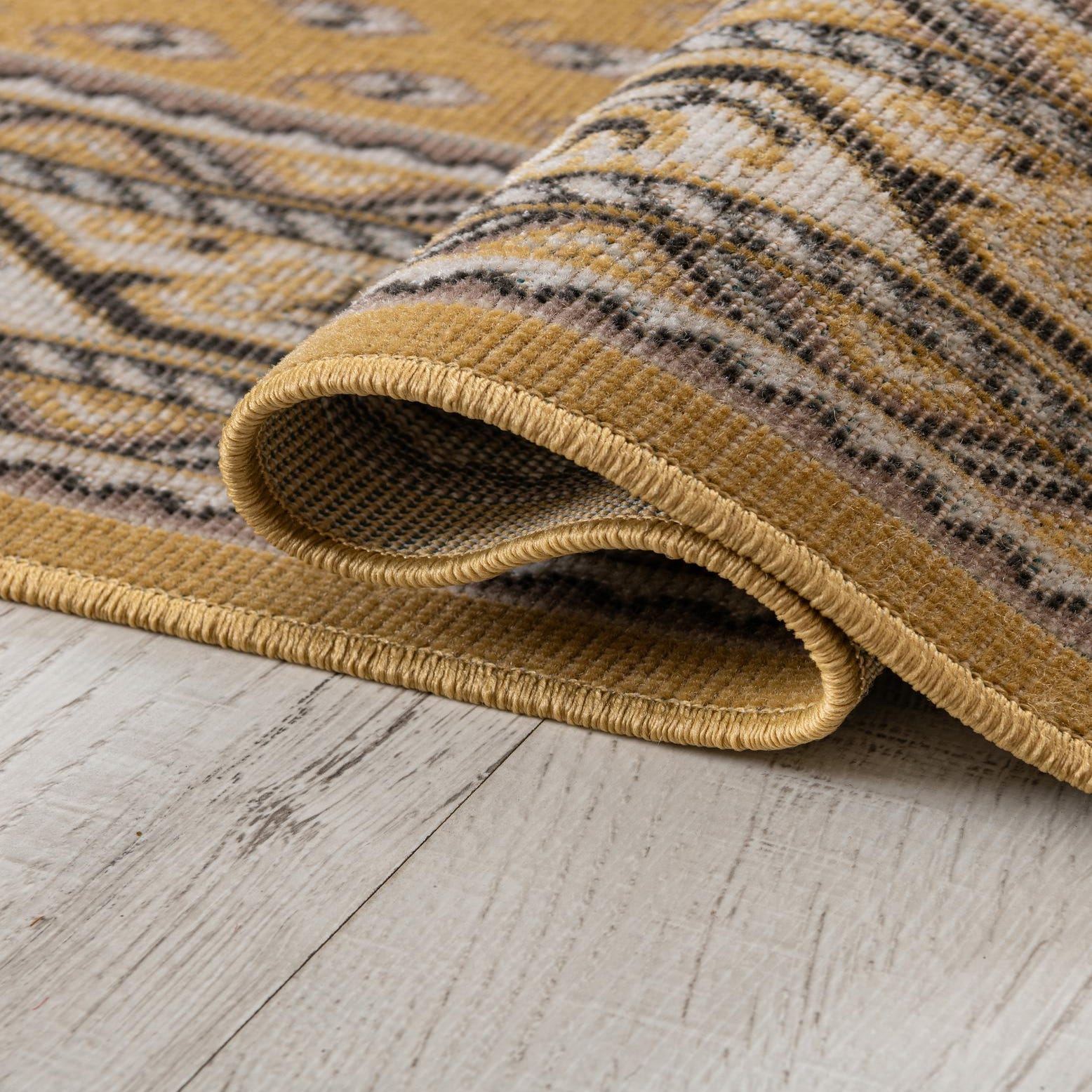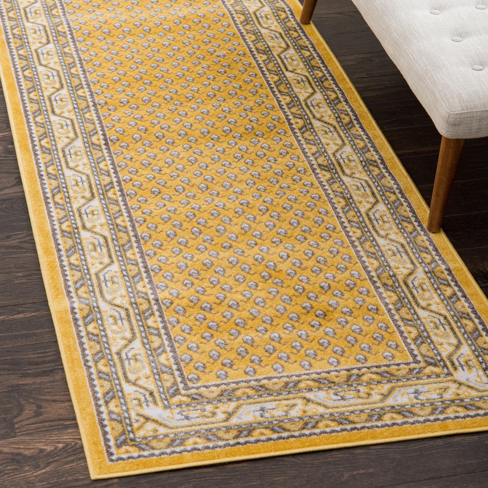 The SoHo Collection presents a refined 10 Ft Runner that harmonizes gracefully with a variety of home settings. Crafted with 100% polypropylene, this machine-woven rug offers a practical and durable flooring solution. The rug features a radiant yellow background, artfully complemented by accents in gray, ivory, and light brown. A traditional pattern adorns the piece, showing an intricate combination of geometric and curvilinear motifs that create a sense of rhythm and flow across the surface.