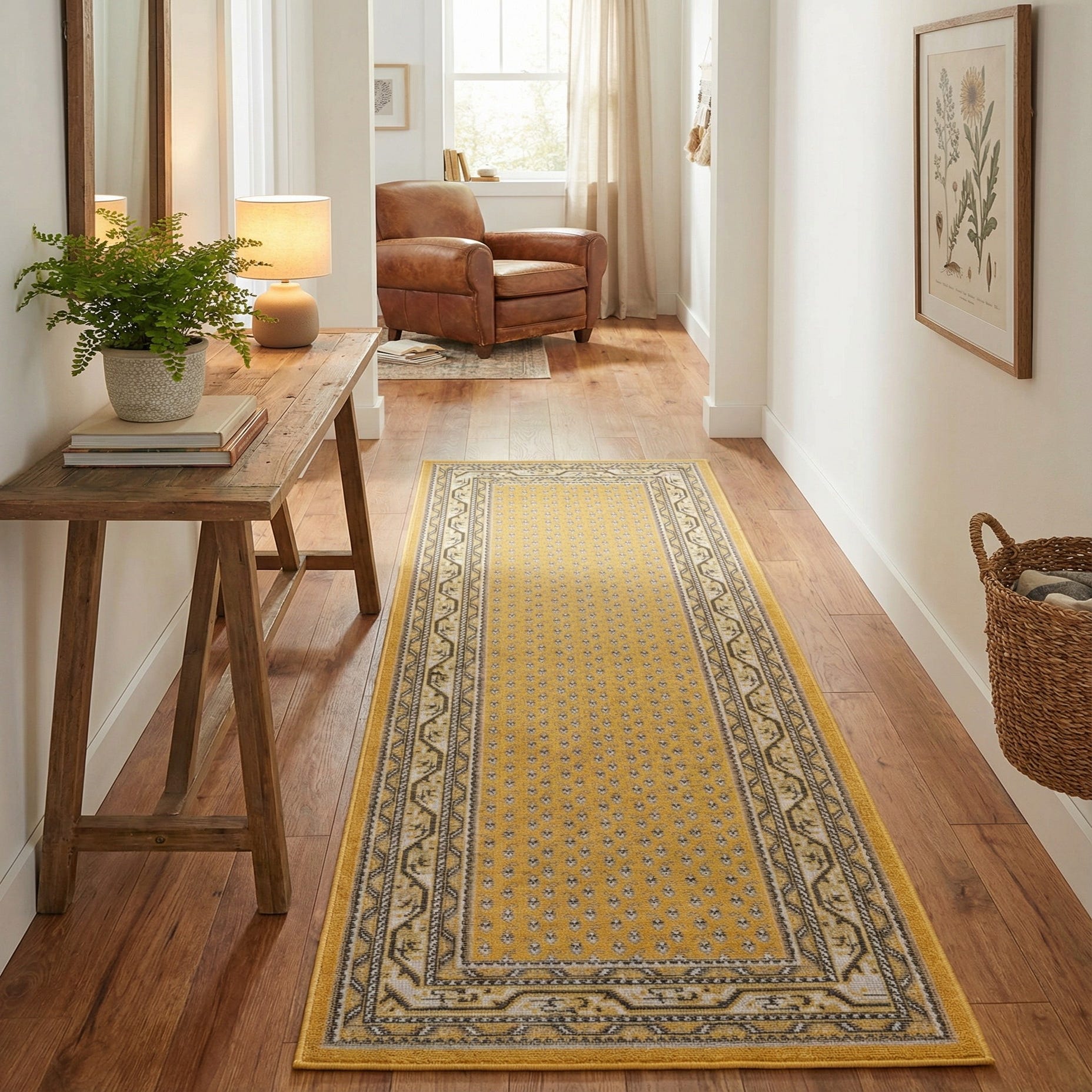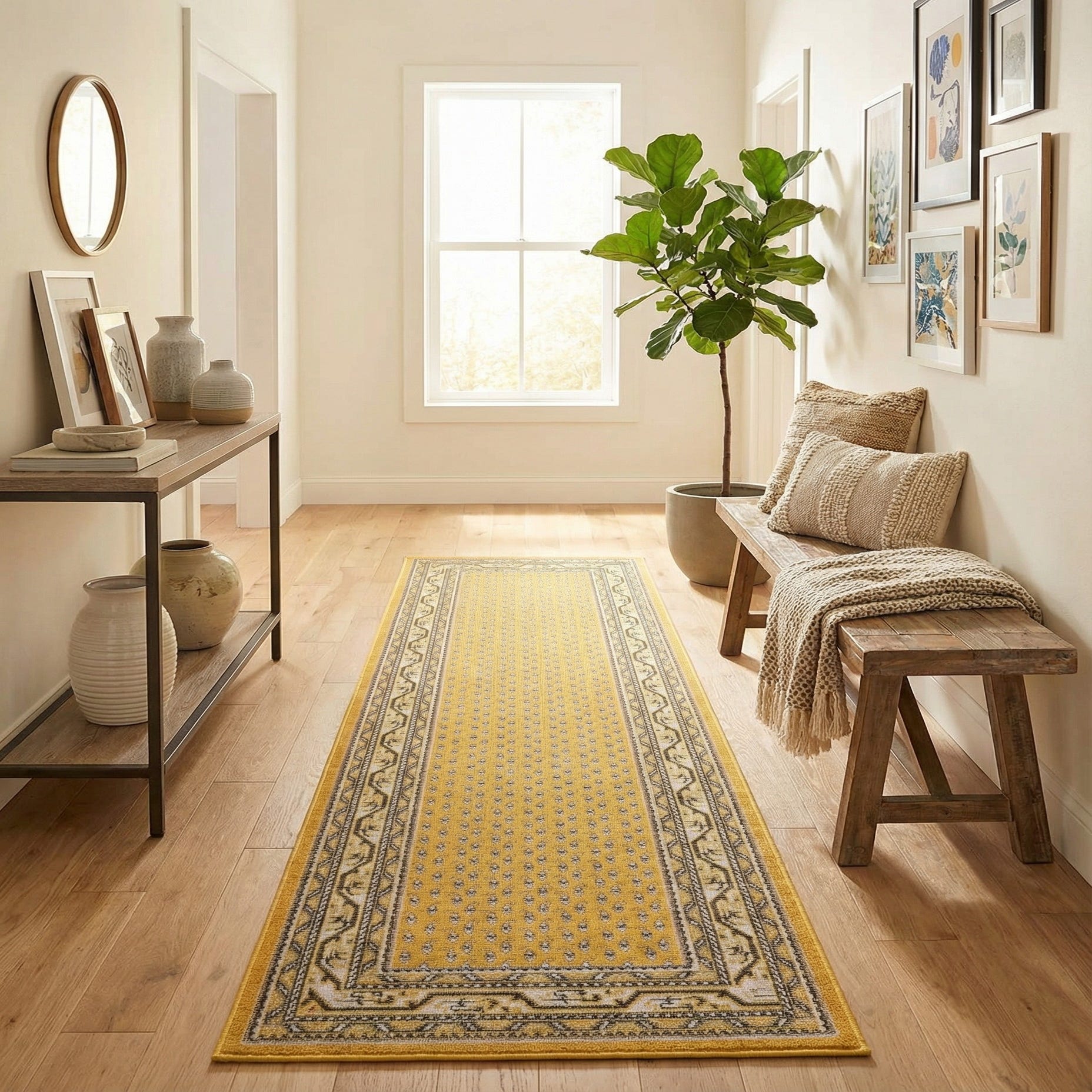 The SoHo Collection presents a refined 10 Ft Runner that harmonizes gracefully with a variety of home settings. Crafted with 100% polypropylene, this machine-woven rug offers a practical and durable flooring solution. The rug features a radiant yellow background, artfully complemented by accents in gray, ivory, and light brown. A traditional pattern adorns the piece, showing an intricate combination of geometric and curvilinear motifs that create a sense of rhythm and flow across the surface.