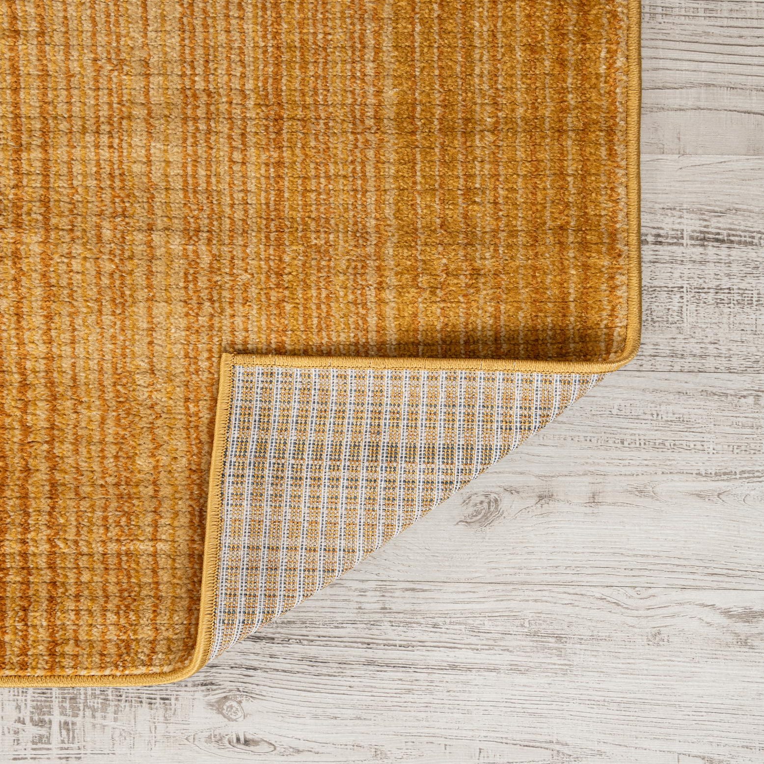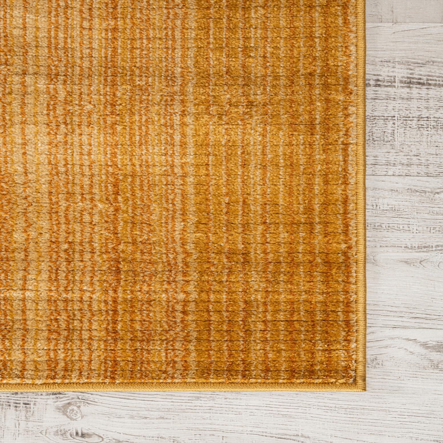 A warm yellow rug with a horizontal striated pattern in varying tones of yellow and soft cream highlights. Thin, irregular bands run across the field to create a subtly layered look that reads both modern and relaxed. The machine-made polypropylene construction produces a low-profile, tightly woven pile that feels smooth underfoot with a gentle, slightly velvety finish.