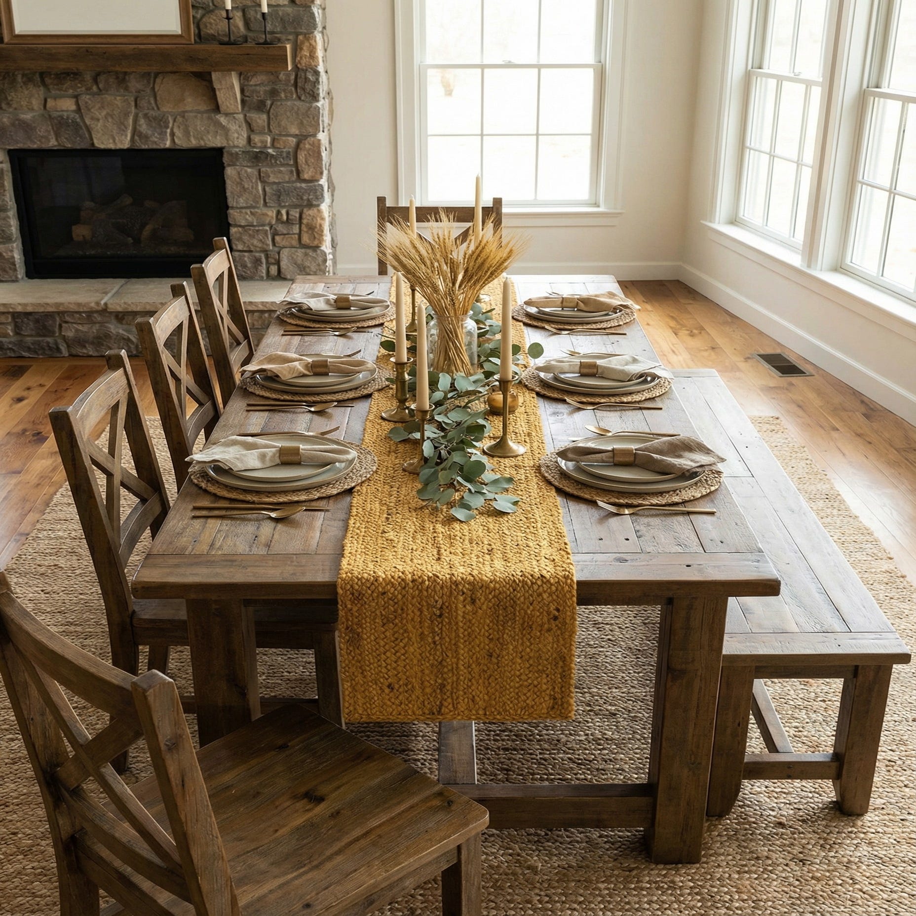 Use it to warm a wood dining table or layered over a neutral linen cloth for an easy, lived-in look. It pairs well with farmhouse and coastal schemes, rattan or woven seating, and simple ceramic or terracotta tableware; the yellow contrasts nicely with cool blues and soft greens or complements warm woods and brass accents. Also suited to a console or sideboard to bring color and texture to an entry or serving area.
