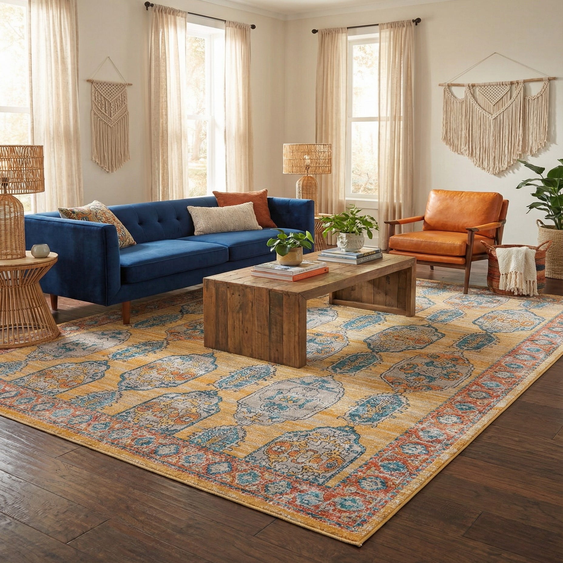 Primary color is Yellow. Colors in this rug include: Yellow, Blue, Ivory, Light Blue, Orange, Rust Red, Terracotta.