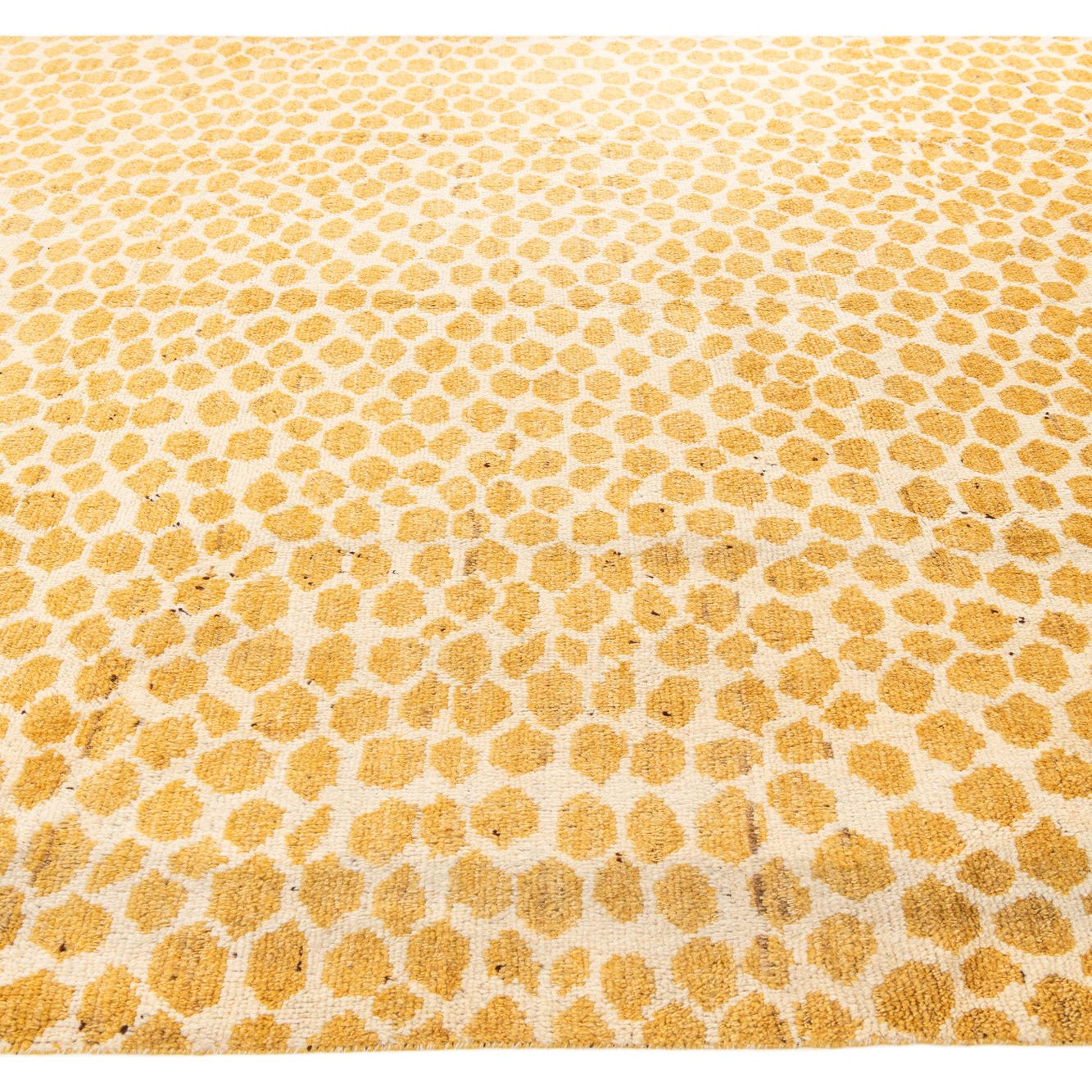 A 10x13 rectangular yellow and cream modern abstract wool rug with a high pile, suitable for a living room.