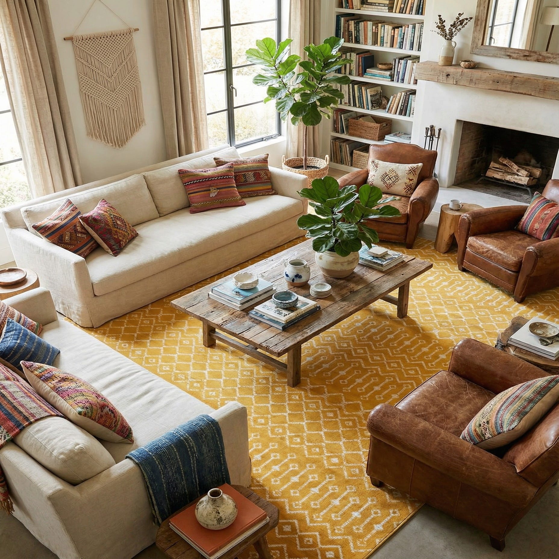 This sunny, graphic rug works well as an anchor in a contemporary living room, a bright breakfast nook, or a casual bedroom. Pair it with natural woods and rattan for a relaxed bohemian vibe, with white or light oak furnishings for modern farmhouse rooms, or with streamlined mid-century pieces and warm metal accents for a lively, modern look.