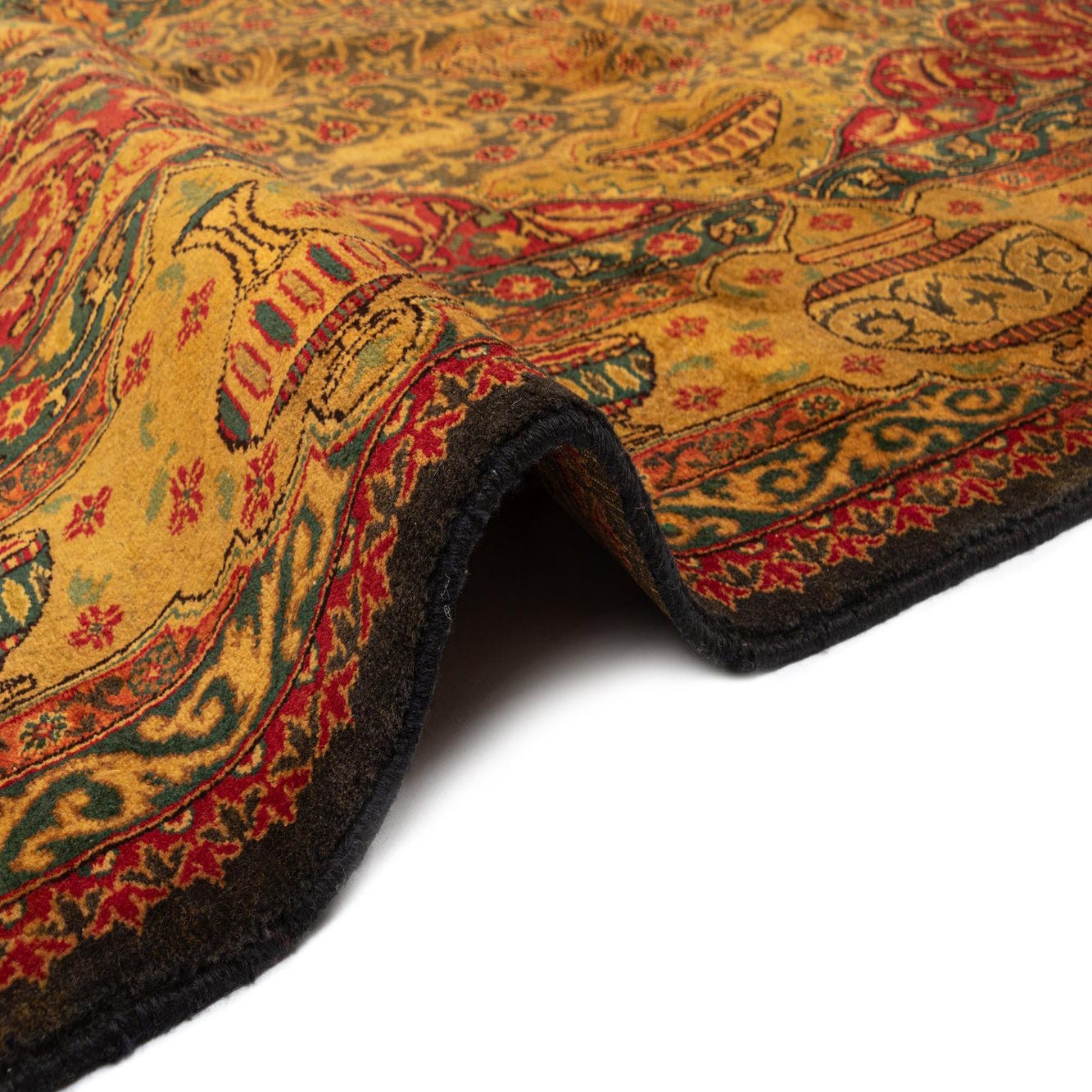 A 10x13 rectangular Kashmar Persian wool rug featuring an intricate yellow and gold traditional pattern with red and blue accents.