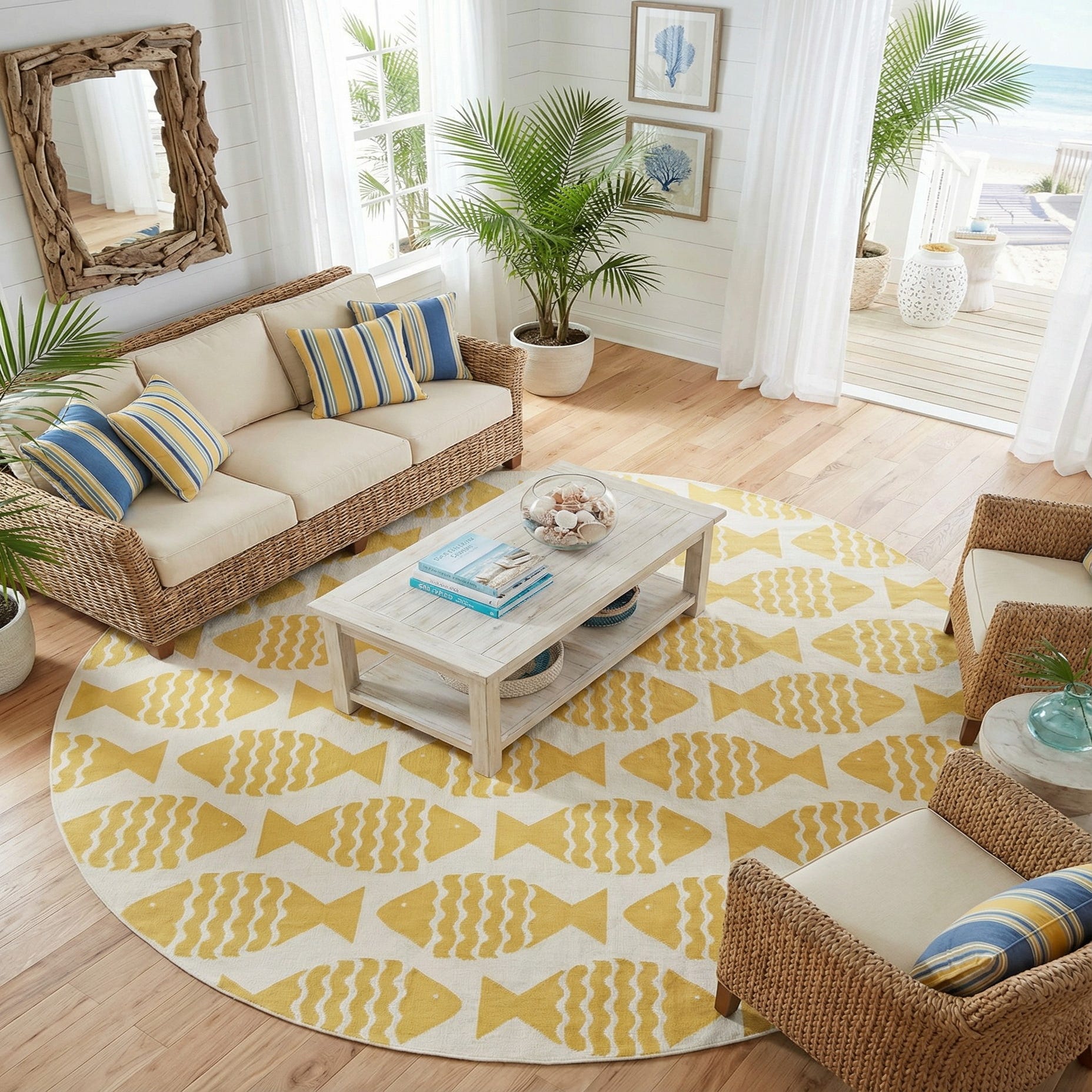 Round yellow and white rug with a repeating pattern of stylized yellow fish, suitable for a patio or indoor space.