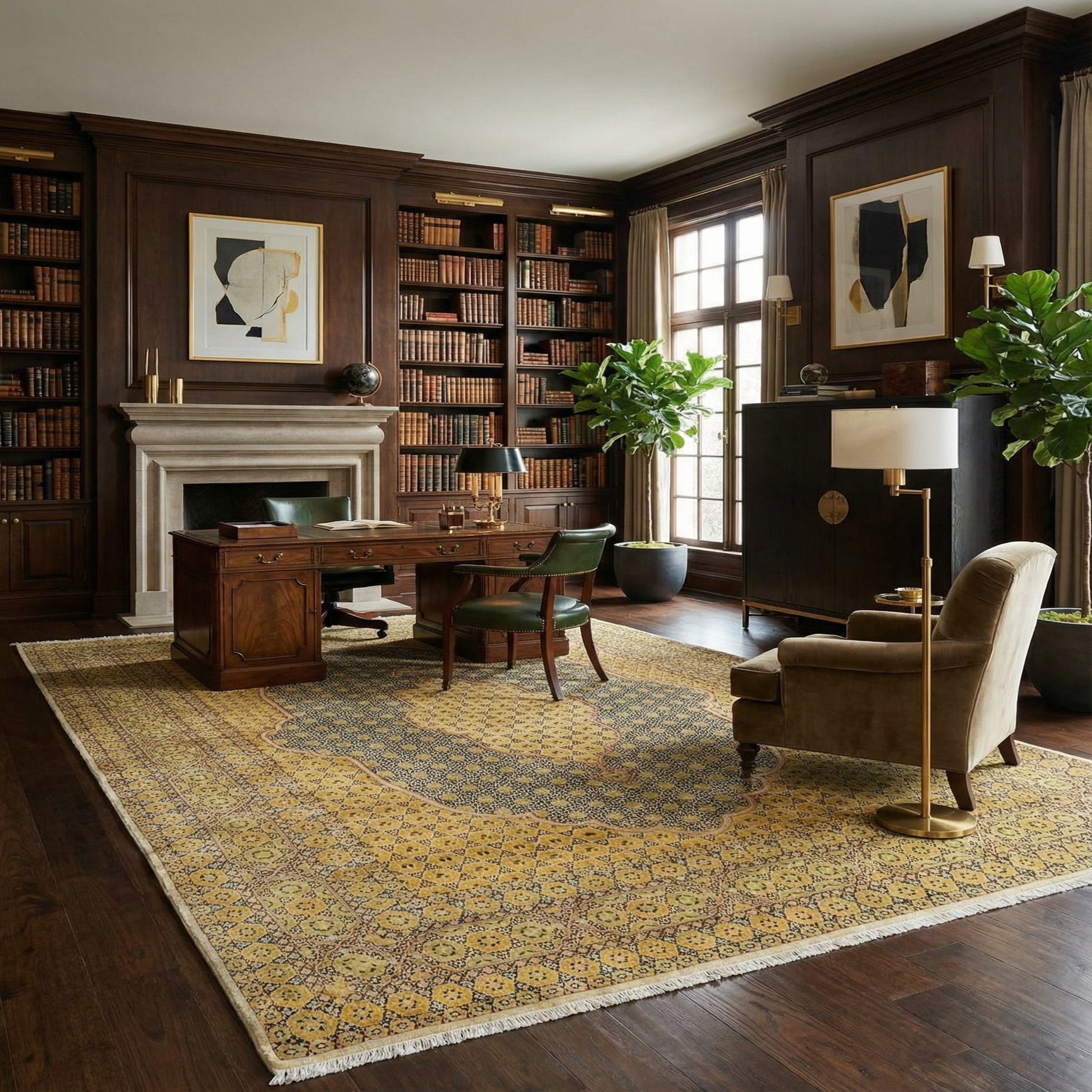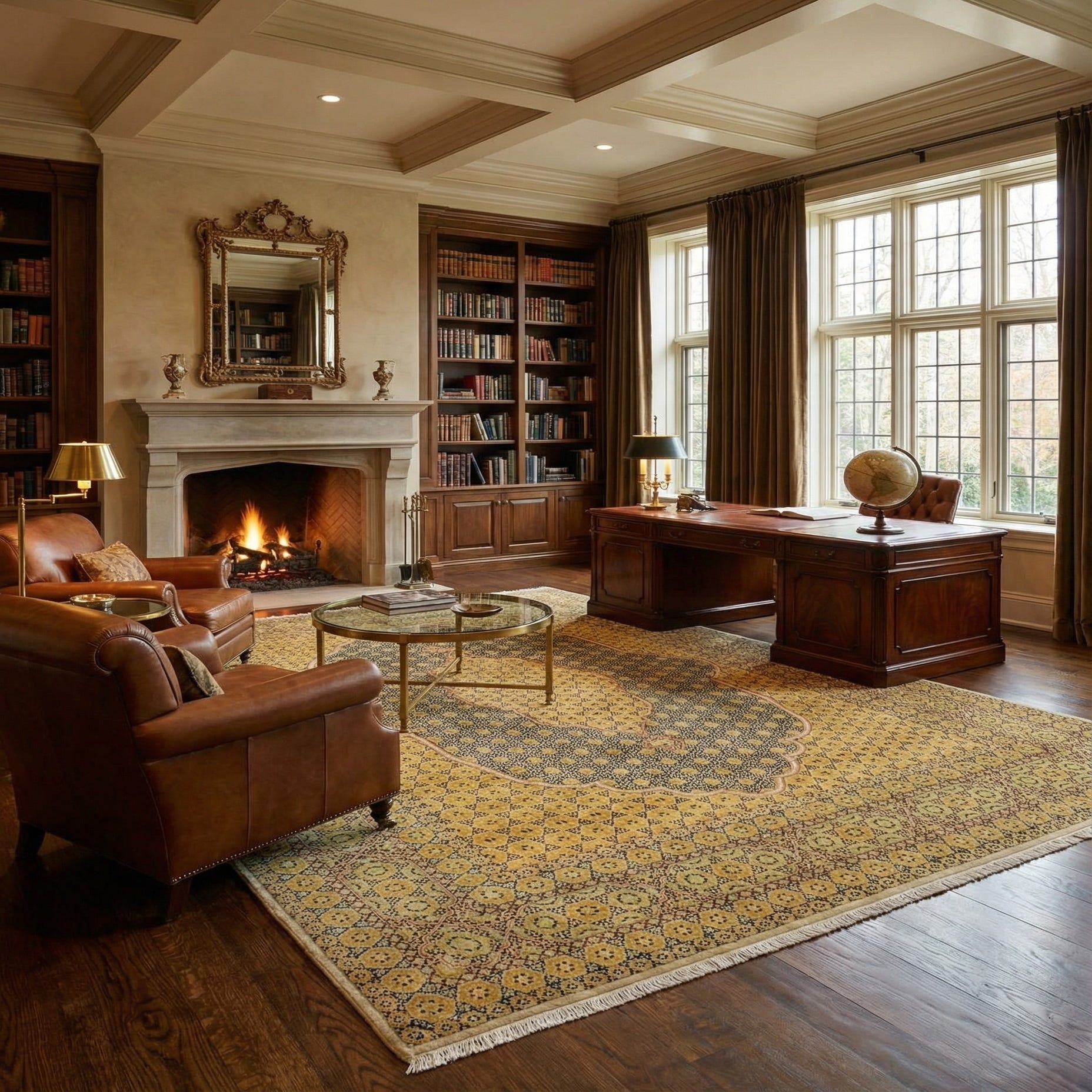 A large 12x15 rectangular yellow Persian rug with an intricate black and gold medallion pattern, suitable for an indoor living space.