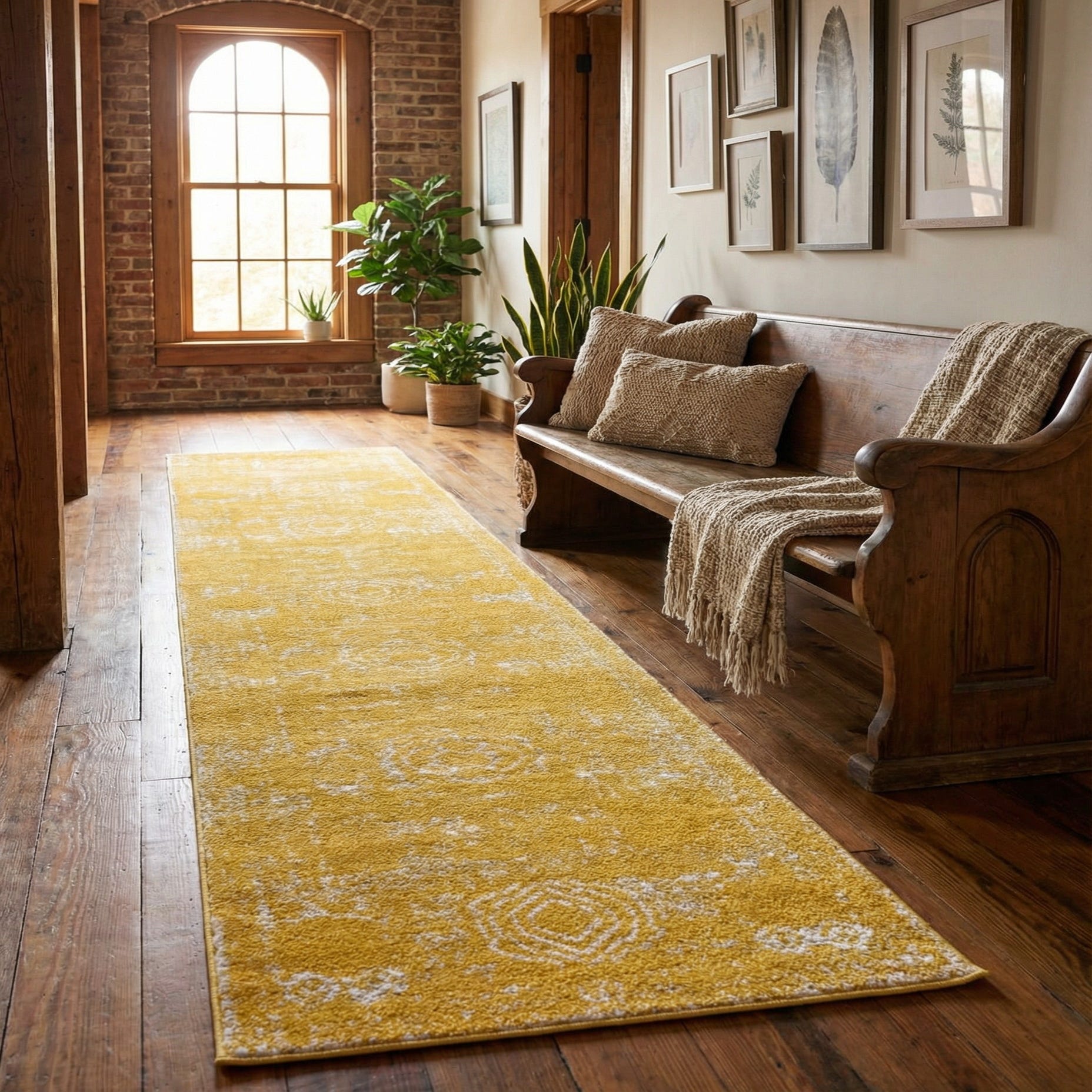 A warm yellow ground gives this runner an immediate sense of brightness, while soft ivory medallions run down the center in a gently distressed, vintage-inspired motif. The pattern combines geometric medallion centers with small, flourished accents for a layered look rather than a crisp, high-contrast print. Machine-made from 100% polypropylene, the surface feels soft and slightly plush underfoot with a low sheen that catches light subtly, offering a comfortable texture without being overly lofty.