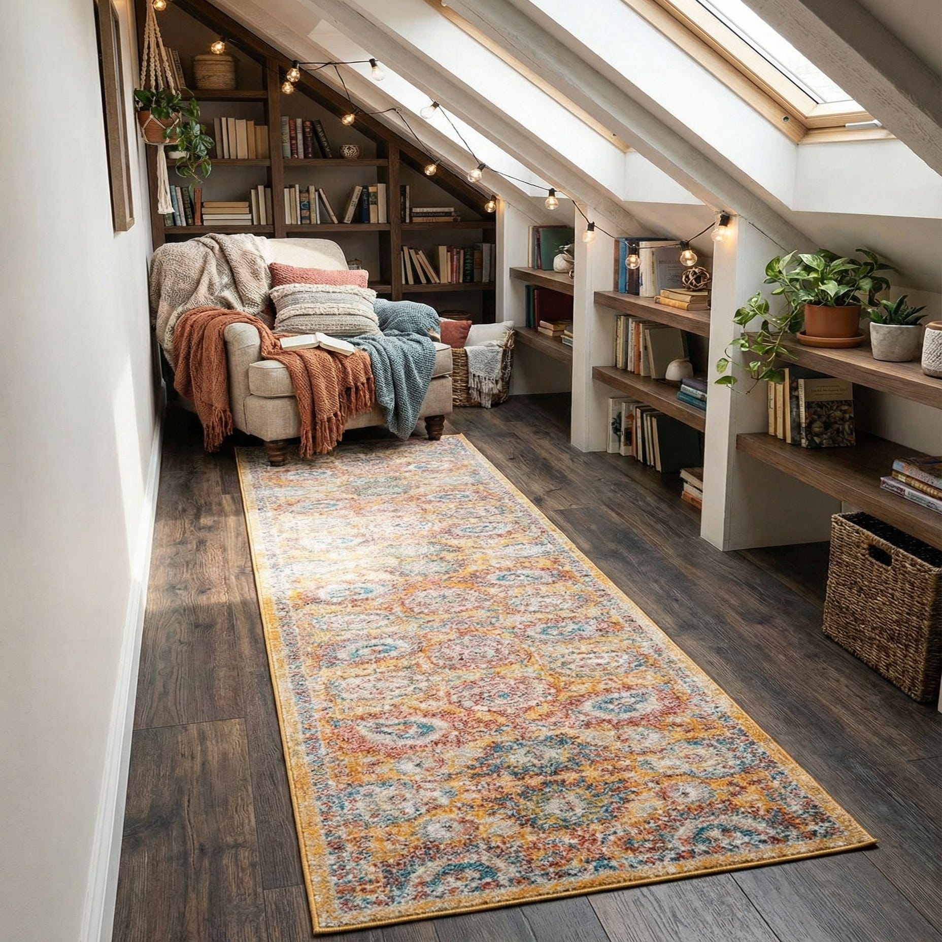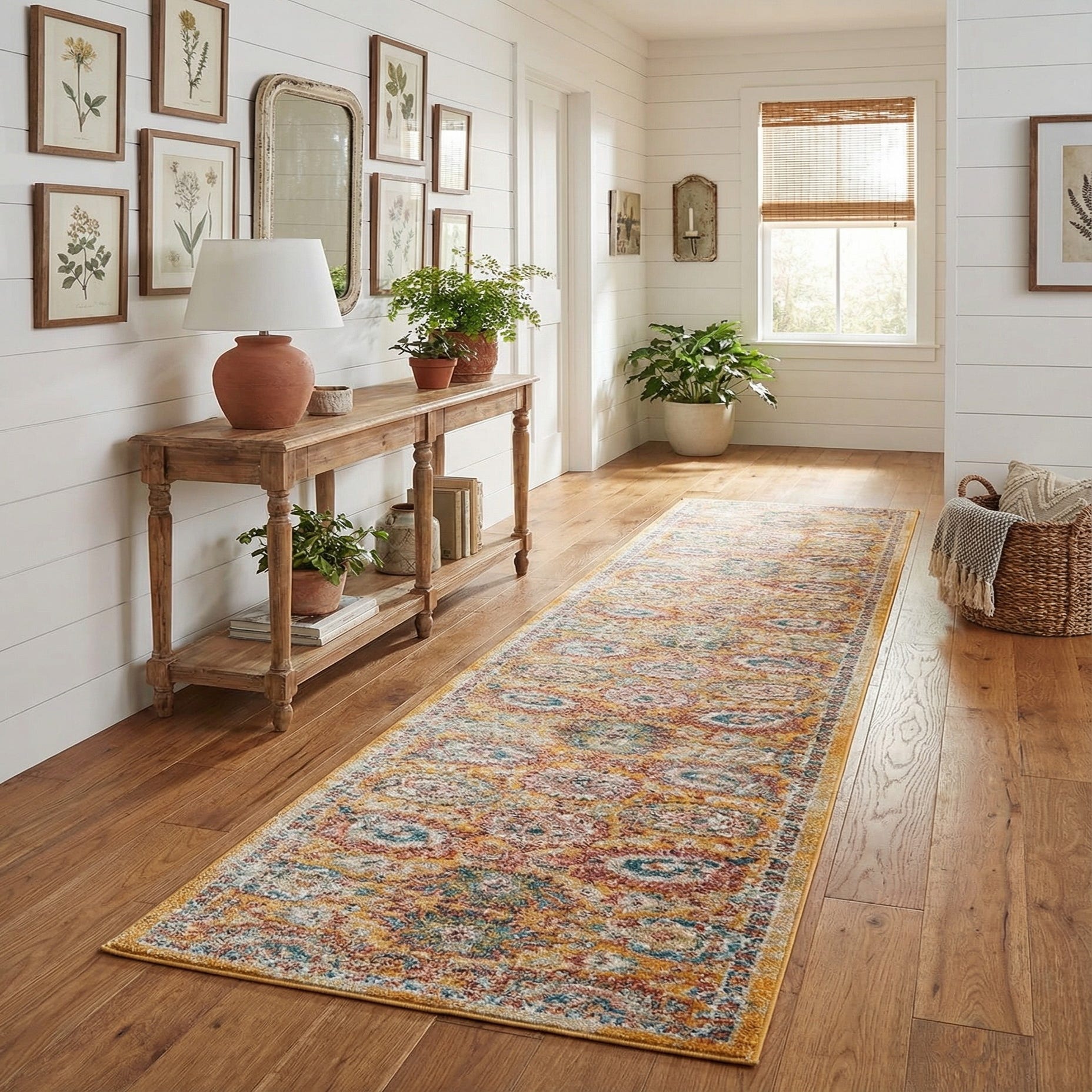 This runner works well in long, narrow spaces — hallways, entryways, or alongside a bed — and pairs especially nicely with warm wood tones, neutral walls and accent pieces in blue or rust to pull colors from the rug. Its mix of classic patterning and contemporary color makes it suited to eclectic, transitional, or casual traditional interiors where a touch of color and texture helps unify the room.