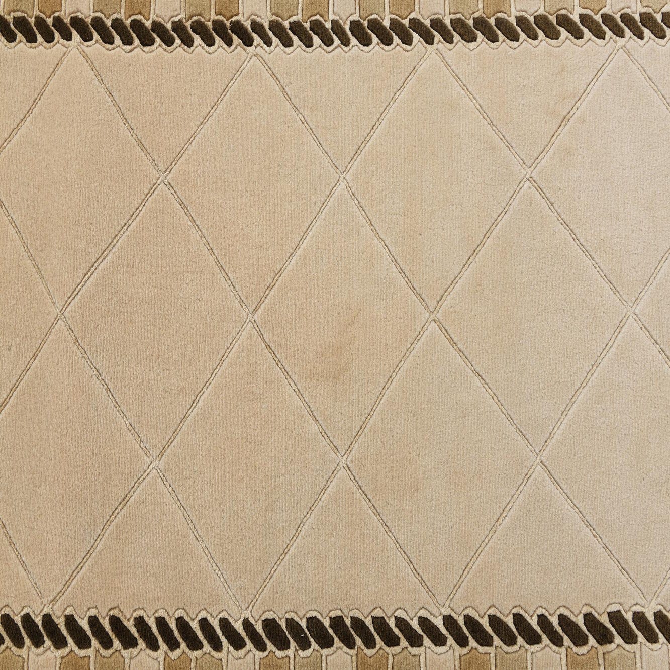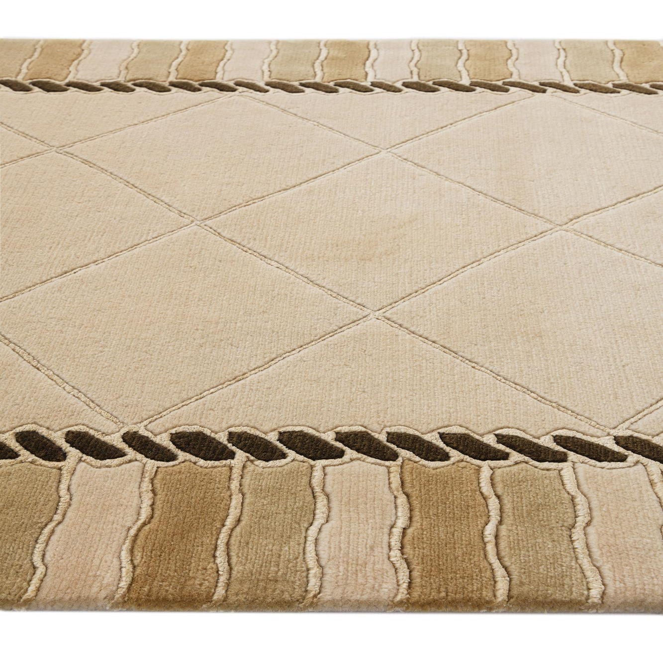 A hand-made wool and cotton runner with a warm yellow ground, this piece pairs a restrained central field with decorative borders for a balanced look. The center shows a subtle diamond lattice worked into the pile, while a dark brown twisted-rope motif frames the field. Beyond that, a banded outer border of tan and brown stripes creates a sunburst-like rhythm along the length, and short fringes finish the ends. The wool surface feels soft and slightly dense underfoot, with the carved and raised border details adding a gentle, tactile contrast against the smoother central area.