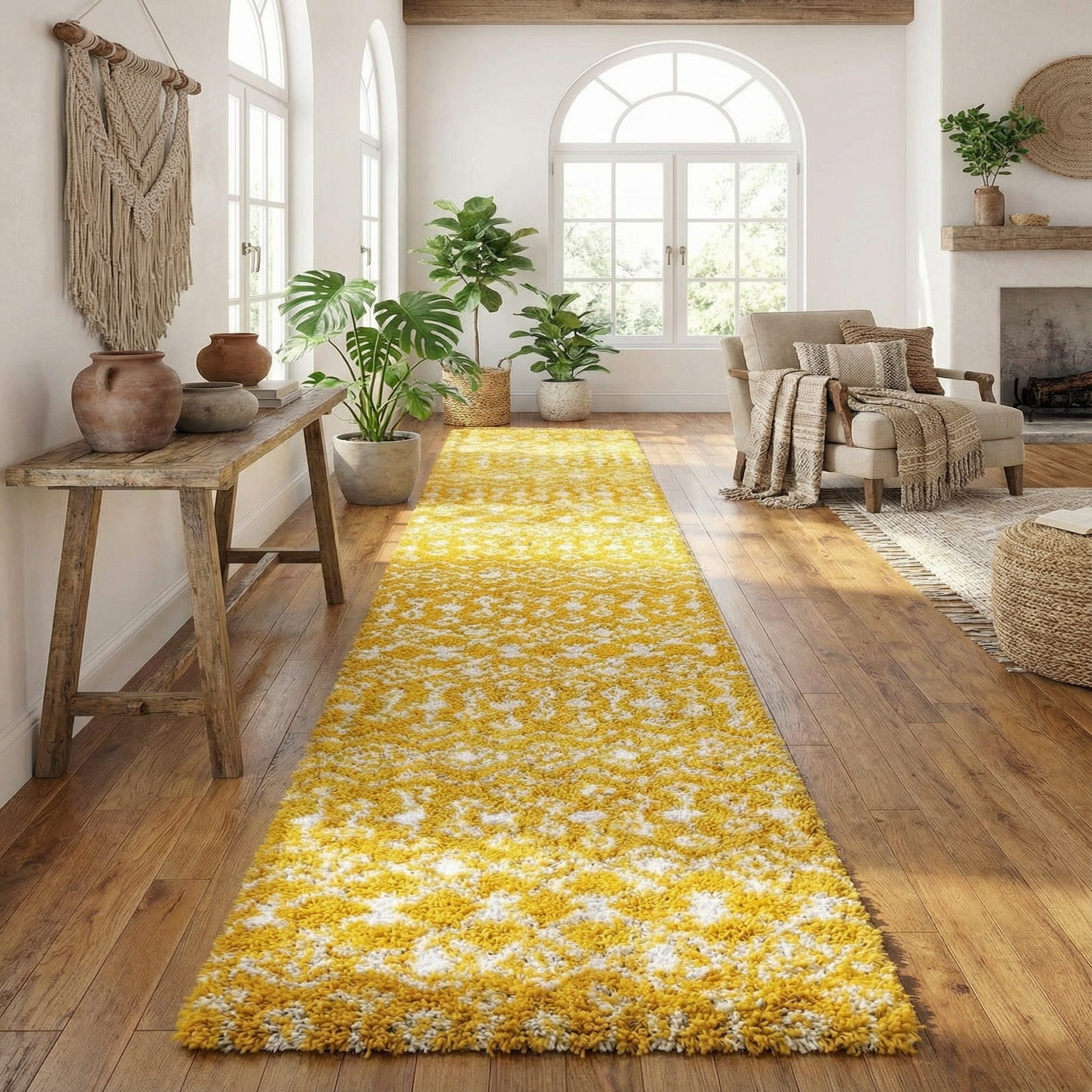 This runner is well suited to long, narrow spaces such as hallways and entryways and can also anchor a kitchen or gallery-style corridor. Pair it with light wood or white-painted floors for a fresh, modern look, or combine it with layered textiles and natural fibers for a relaxed bohemian or coastal scheme. It brings a warm, energetic pop of color that complements neutral furnishings and simpler geometric accents.