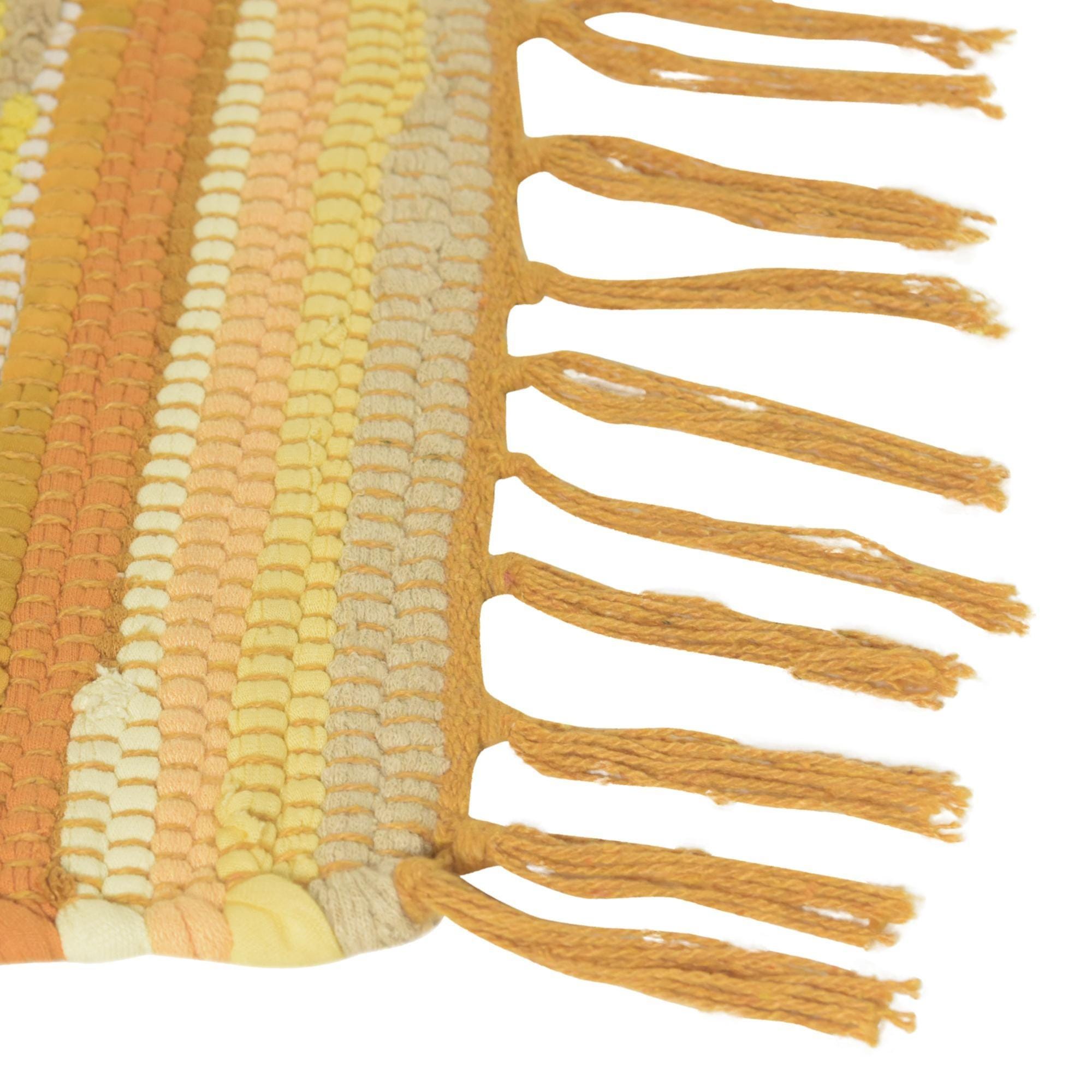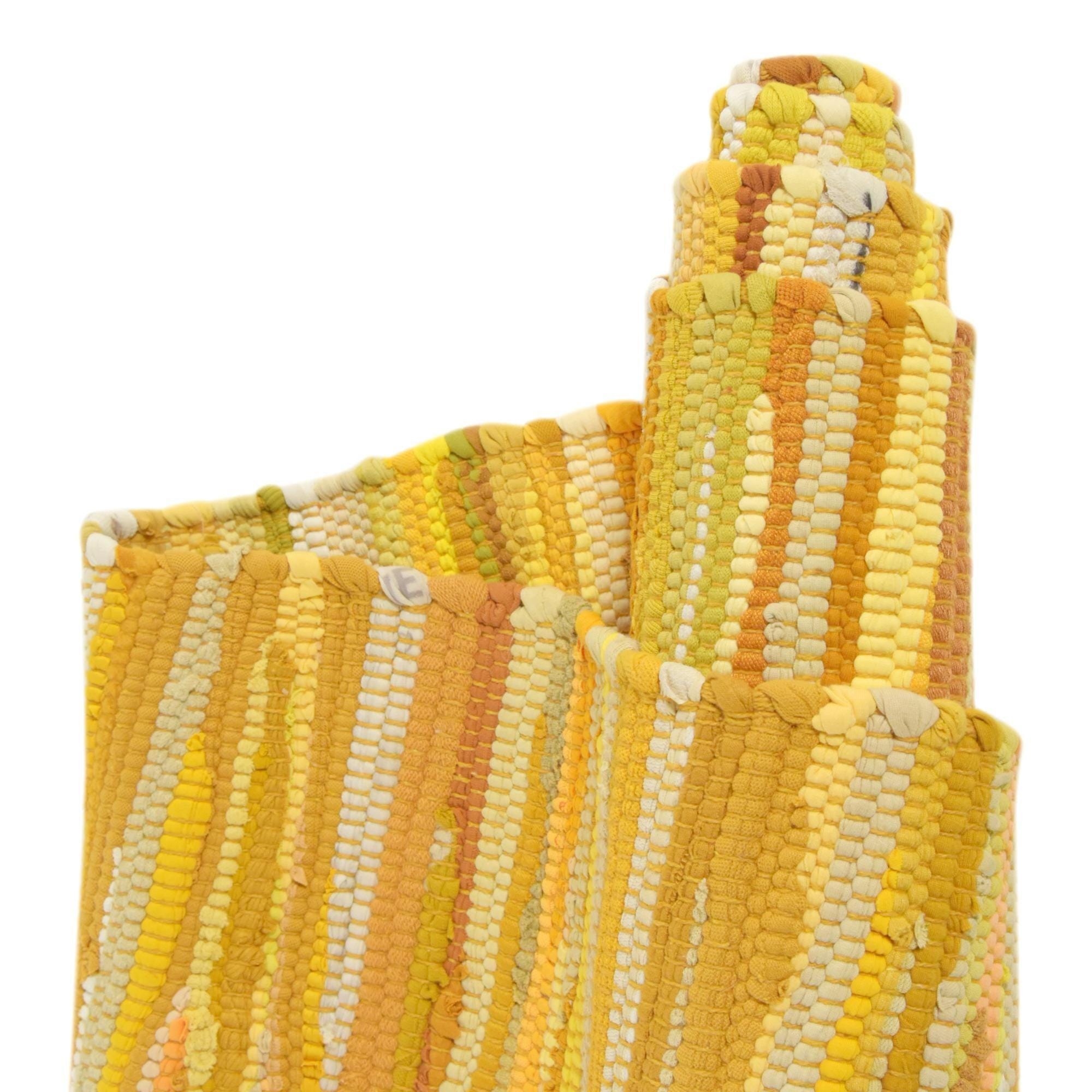 A 2x3 rectangular Chindi Cotton rug featuring varied yellow and gold stripes with a textured flatweave and fringed ends, ideal for a kitchen or entryway.