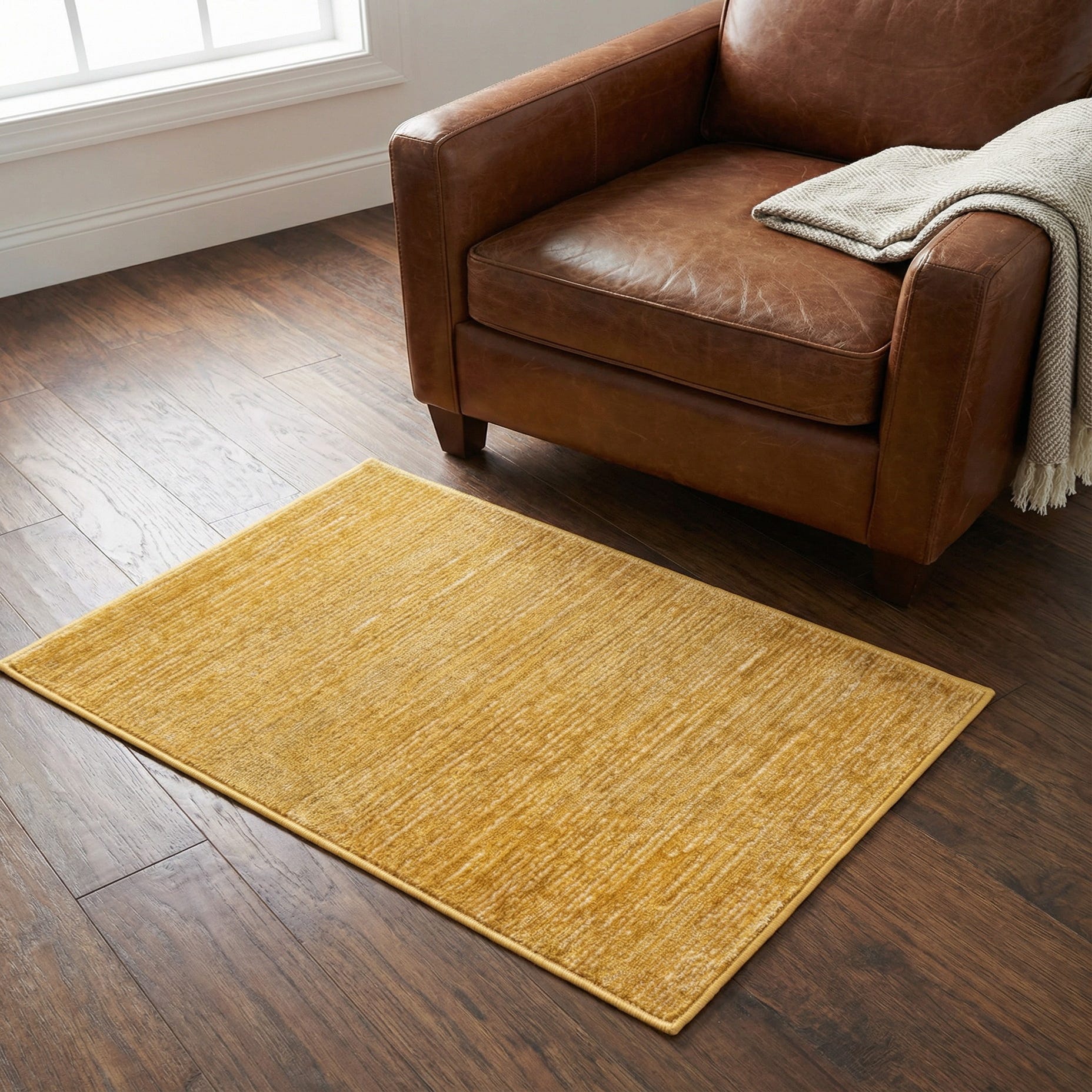This rug fits neatly into modern, mid-century and Scandinavian schemes as a single-color anchor or layered accent. Use it to brighten an entryway, tuck it beside a bed, place it in front of a sink, or set it under a small reading chair to introduce warmth without a busy pattern. Pair with warm woods, neutral textiles, and metal accents in brass or matte black to balance the yellow and highlight the rug’s tactile presence.