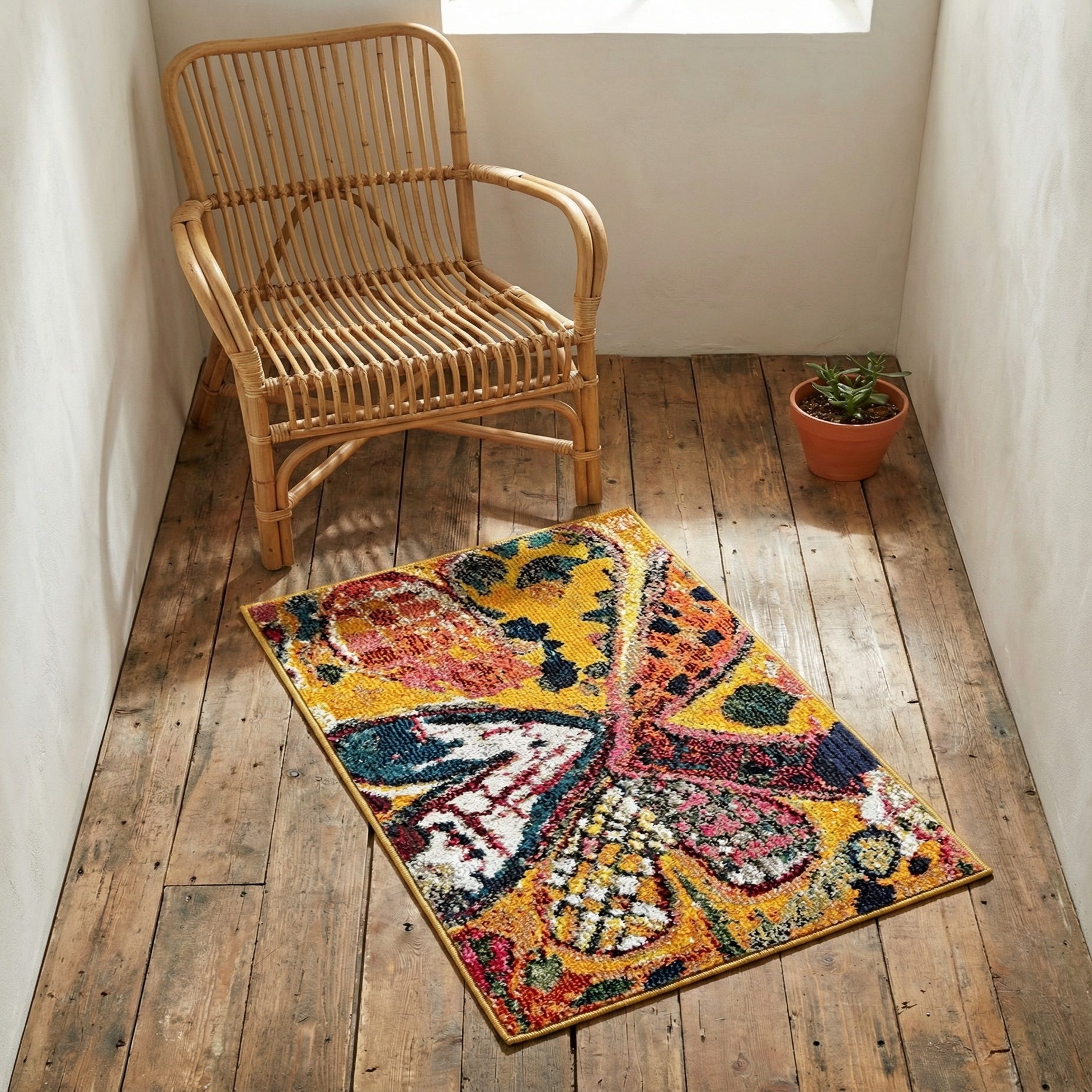 Use this piece as a colorful anchor in an entryway, a bright pop beside a bed, or layered in front of a sofa to add depth and pattern to a living area. It pairs well with warm wood furniture and leather, complements mid-century modern silhouettes, and livens up neutral or minimalist rooms that need a playful accent. The vibrant palette also works nicely in creative spaces, a home office, or a child’s playroom where color and personality are welcome.