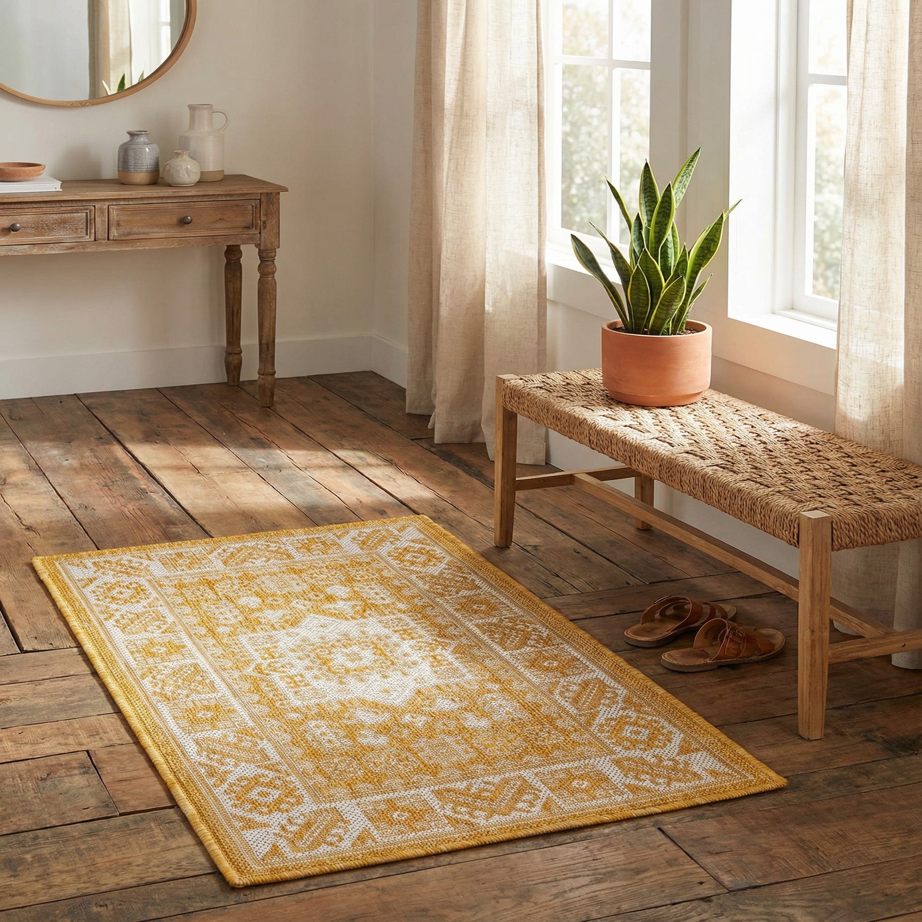 With its bold hues and dynamic design, this rug is well-suited for patios, decks, and other outdoor zones. It can also serve as an exuberant addition to casual indoor spaces, such as sunrooms or play areas, where a splash of color and pattern is desired. The cheerful yellow can invigorate neutral color palettes or complement existing warm tones within a décor scheme.