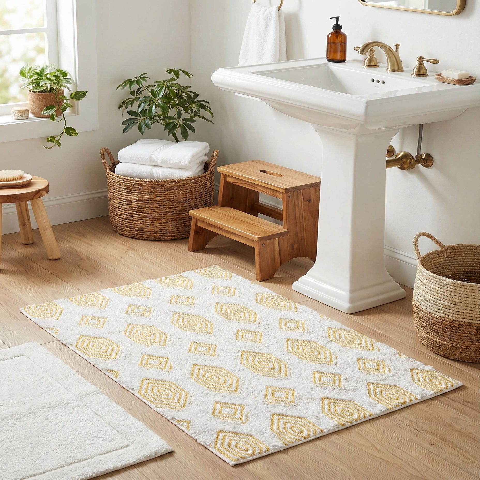 A sunny yellow ground anchors a repeating geometric motif of concentric diamonds and elongated hexagons in ivory, giving this rug a modern-boho look with clean, rhythmic lines. The surface combines a low, smooth cotton base with a raised, tufted ivory pile that creates a pleasant high-low texture you can feel underfoot. Machine-made of 100% cotton, it has a soft, natural hand and a casual yet refined presence that complements a variety of interiors.