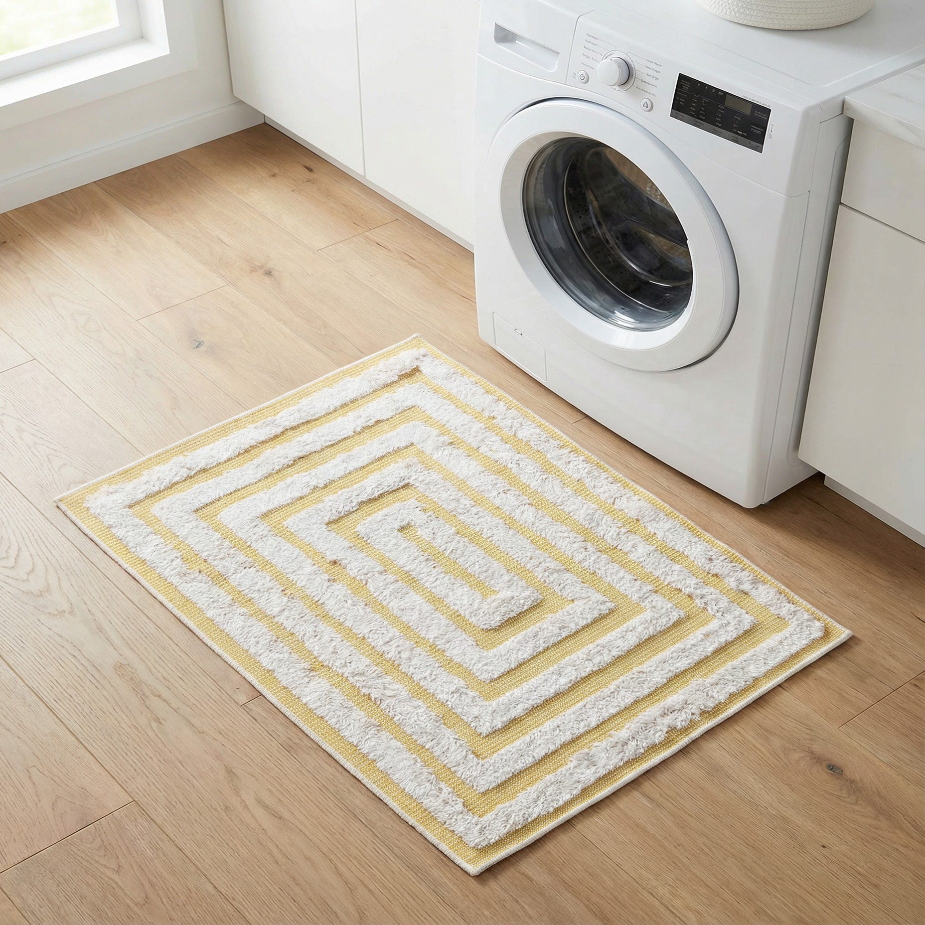 A graphic arrangement of concentric rectangular bands in soft ivory sits atop a sunny yellow ground, creating a modern, maze-like motif with clear, clean lines. The ivory stripes are made from a higher-pile cotton tuft that feels plush underfoot, while the yellow background is flat-woven and smooth, offering a pleasant tactile contrast. Machine-made from 100% cotton, the construction delivers a cozy, approachable texture that reads warm without being fussy.